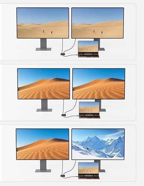 - Адаптер USB C C для двойного HDMI: он позволяет вашему USB -ноутбукам расширить 2 различных мониторов. Двойной 4K 30 Гц дисплей в системе MacOS (только поддерживает зеркальный режим из -за ограничений MacOS). Windows поддерживает MST (режим расширения) и SST (режим зеркала), разрешение до 1080 при 60 Гц.