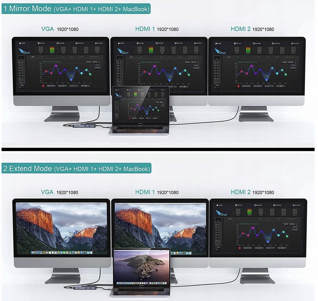 Это больше не проблема, установите программное обеспечение, подключите хаб и наслаждайтесь изображением на двух дополнительных мониторах HDMI и VGA.