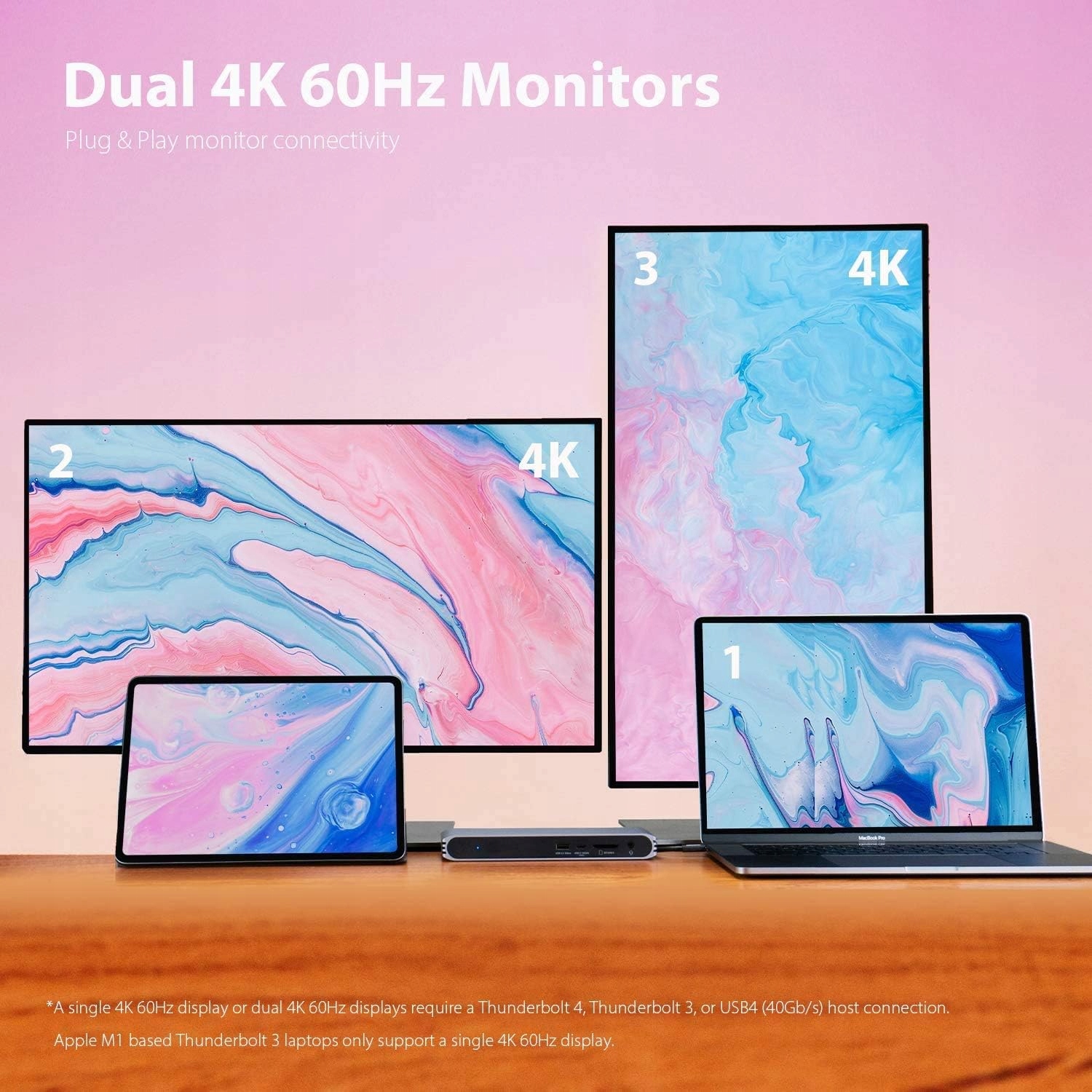 Док-станция имеет два встроенных порта HDMI 2.0b для прямого подключения двух мониторов 4K 60 Гц в «расширенном» или «расширенном» режиме. «зеркало» на ваш ноутбук с помощью Thunderbolt 3 без необходимости использования каких-либо видеоадаптеров USB-C. Ноутбуки Apple M1 можно подключить к одному внешнему монитору, что позволяет расширить встроенный дисплей ноутбука до одного внешнего «расширенного» монитора.