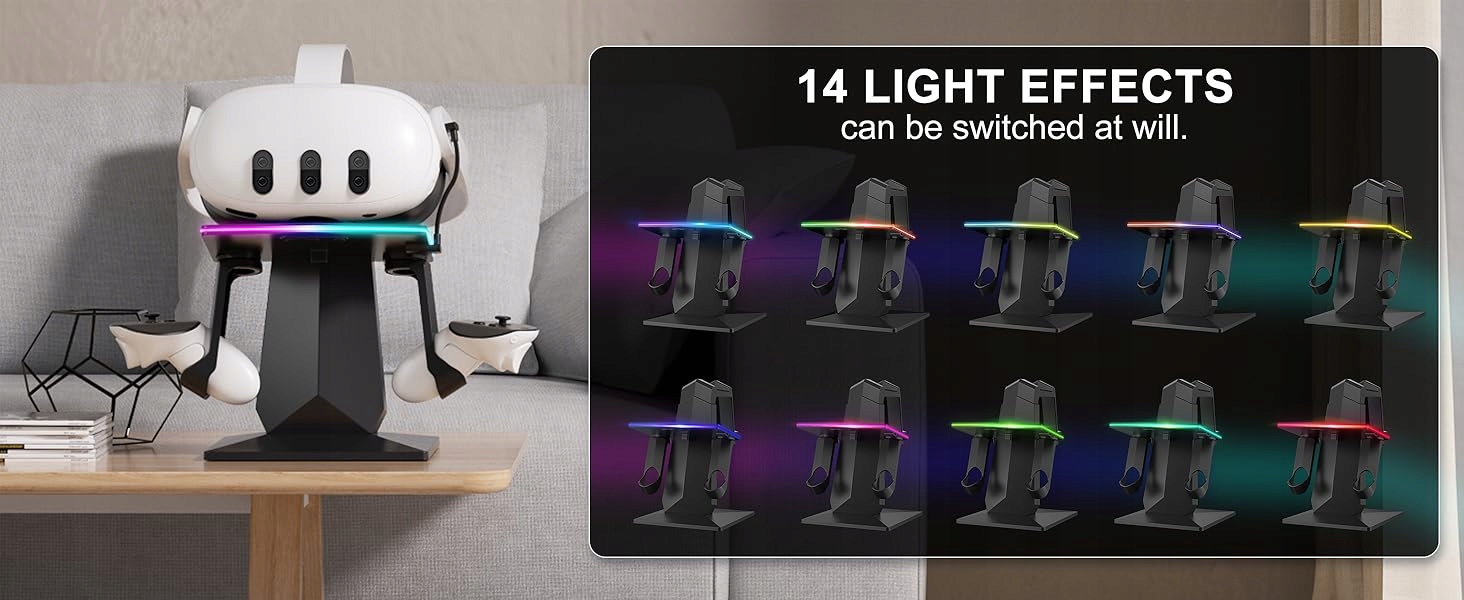 [14-цветная RGB-подсветка] — эта зарядная док-станция Quest 3S не только предлагает функцию быстрой зарядки, но также оснащена регулируемой RGB-подсветкой 14 различных цветов, обеспечивая захватывающий игровой визуальный опыт и создавая для вас уникальное игровое пространство.