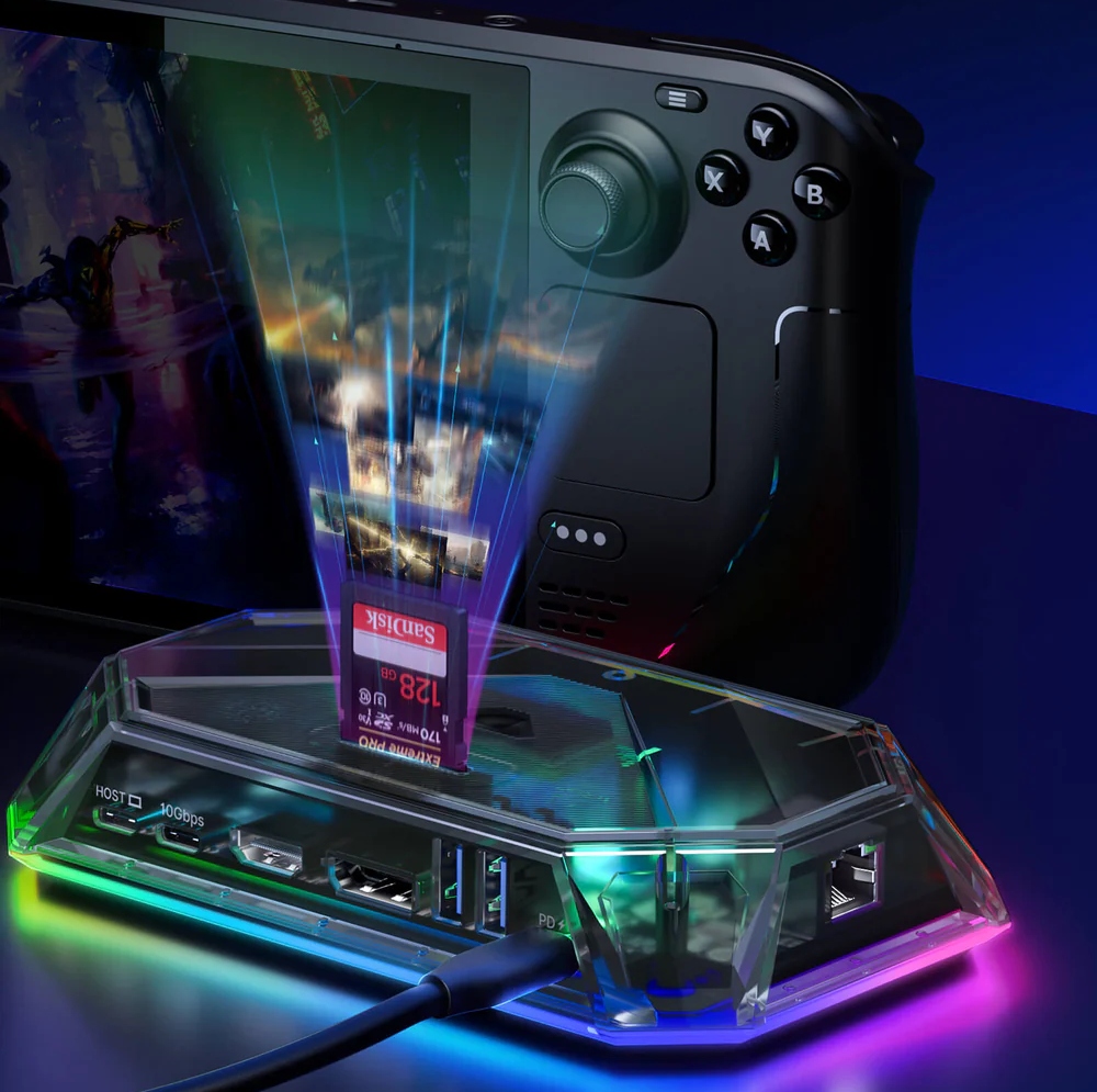 Представляем многофункциональную док-станцию с RGB-подсветкой 12-в-1 JSAUX HB1201S, незаменимый инструмент для каждого владельца консоли Steam Deck, который хочет превратить свое портативное устройство в продвинутый мультимедийный центр, а также для всех остальных ищет компактное и универсальное решение для расширения своей рабочей станции.