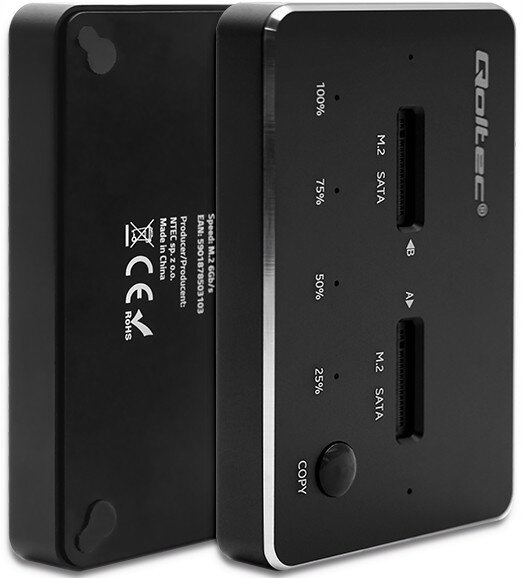 Портативная док-станция позволяет копировать данные путем подключения SSD-накопителя к компьютеру с помощью быстрого разъема USB C или прямого автономного копирования с диска A на диск B. Общая емкость диска составляет 4 ТБ. Функция Plug & Play, установка не требуется. Стандартная поддержка UASP.