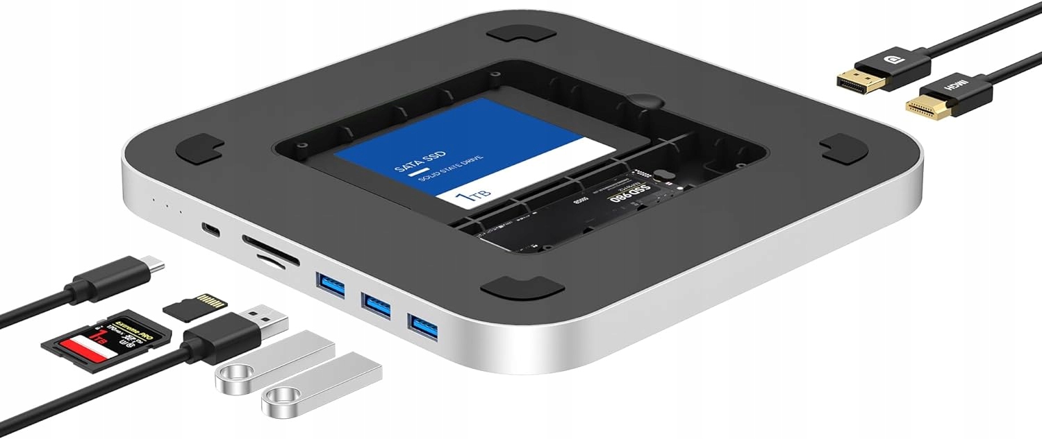Концентратор Qwiizlab USB C с корпусом для двух дисков, док-станция для Mac Studio Mac Mini M2/M1/Intel, Type C 10 Гбит/с, устройства считывания карт 100 МБ/с, DisplayPort 4K HDMI, подходит для SSD M .2 Твердотельный накопитель 2,5-дюймовый твердотельный накопитель SATA (серебристый)