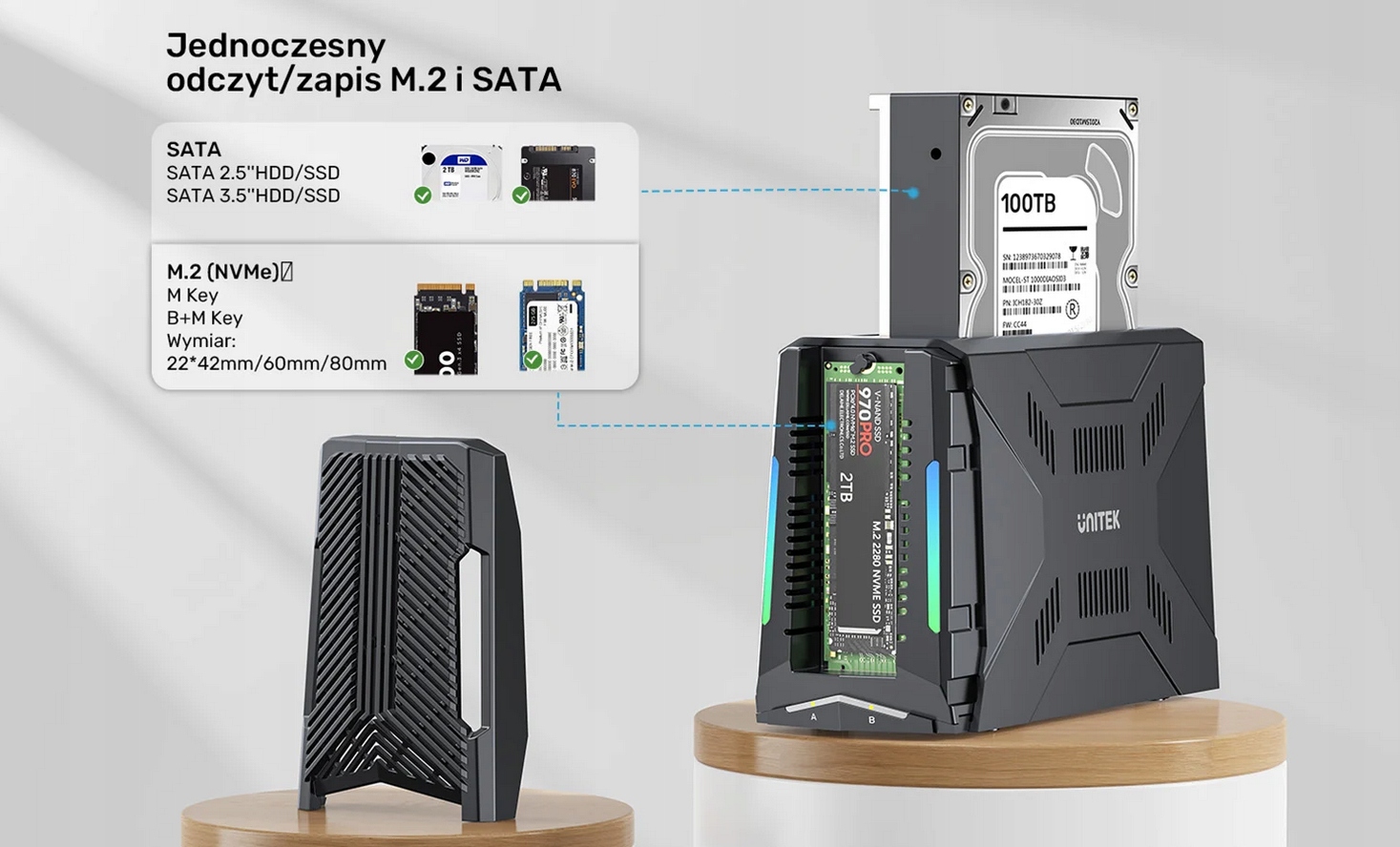 Создайте современную игровую станцию: отсек для накопителей M.2 и SATA Unitek отлично смотрится на столе с клавиатурой и игровыми наушниками. Светодиодная подсветка RGB на корпусе устройства выполняет не только декоративную, но и информативную функцию. Они предоставляют информацию об источнике питания и о том, какой диск в данный момент занят.