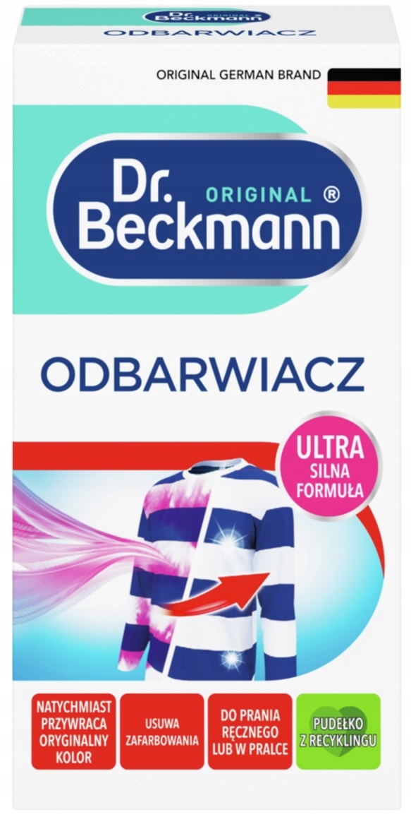Иногда, случайно, красочный элемент получает белый и красит остальные ткани. Доктор доктор Бекманн восстанавливает оригинальный цвет окрашенных тканей со специальными ингредиентами, которые избавляются от нежелательного красителя.