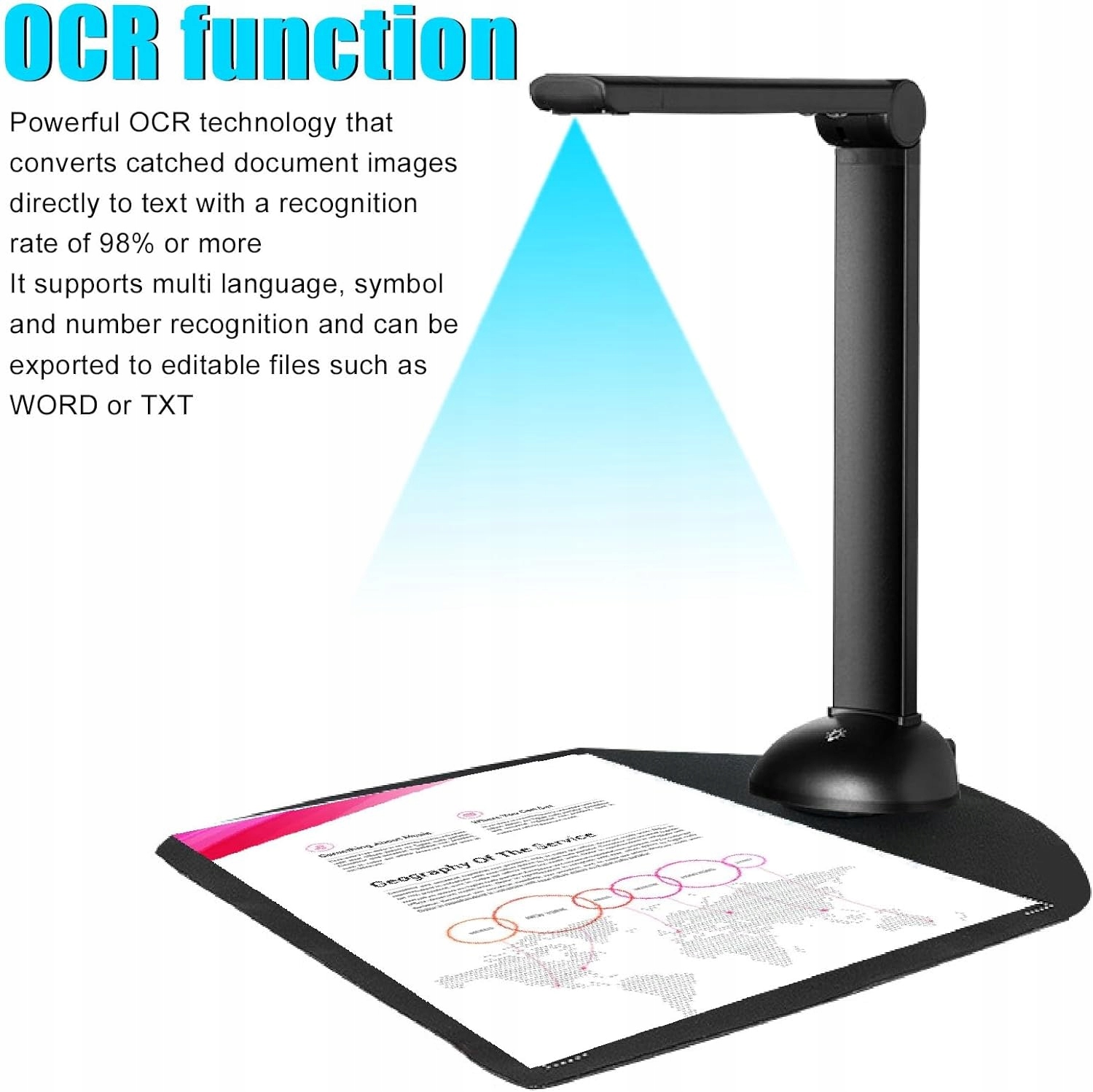 Автокоррекция Камера книжного сканера оснащена новейшими технологиями и оснащена функцией автоматической коррекции одной кнопкой. Даже если изображение искажено, оно может разумно исправить изображение и автоматически создать изображение в течение секунды, что может повысить эффективность работы. Непрерывное сканирование Сканер документ-камеры поддерживает автоматическое пакетное сканирование. Страницы нужно переворачивать только вручную, непрерывное сканирование изображений повышает эффективность работы и поддерживает текстовые документы PDF WORD EXCEL и TXT. Поддерживает форматы А3 и А4. Датчик 10 МП. Датчик CMOS 10 МП позволяет более четко снимать фотографии в реальном времени. Благодаря встроенному светодиодному освещению вы можете делать фотографии с большим диапазоном и лучшим эффектом заполнения с равномерным освещением и интеллектуальным заполняющим светом как в темных, так и в ярких условиях. Работает только в Windows. Функция OCR Документ-камера использует передовую технологию OCR для преобразования захваченных изображений документов непосредственно в текст со скоростью распознавания более 98. Она поддерживает распознавание нескольких языков символов и цифр и может быть экспортирована в редактируемые файлы, такие как WORD или TXT. Отображение в реальном времени Сканер документов поддерживает запись и просмотр видео в реальном времени, а также открывает простые возможности обмена и общения. Он поддерживает функции видео и видеозаписи в реальном времени, подходящие для дистанционного обучения и онлайн-уроков, таких как создание оценок уроков и деловых встреч.