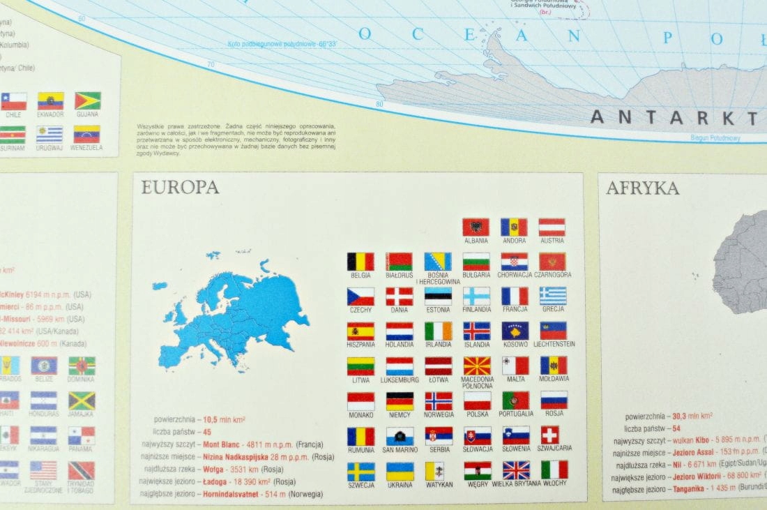 Внизу панели перечислены все страны и их флаги. Также указаны площади материков, количество стран, самая высокая вершина, самое низкое место, самая длинная река, самое большое и глубокое озеро на каждом континенте.