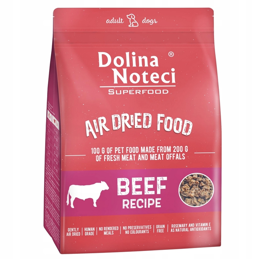 Блюдо Dolina Noteci SUPERFOOD из говядины – это полноценный сухой корм, полностью удовлетворяющий потребности в питании взрослых собак всех пород. В состав сырья входят питательные вещества и биологически активные соединения. 100 г готового продукта изготавливается из целых 200 г свежего мяса и продуктов животного происхождения из говядины, курицы и свинины. Бережный процесс сушки позволяет сохранить как можно больше питательных веществ из сырья, используемого для производства продуктов питания. Мясо и продукты животного происхождения из говядины дают ценный белок, богатый аминокислотами, и являются источником необходимых для здоровья элементов – селена, железа и меди. Говядина также является источником важного для организма собаки витамина В12 и жирорастворимых витаминов. Добавление куриного яйца и куриного жира обогащает сухой корм Dolina Noteci SUPERFOOD незаменимыми ненасыщенными жирными кислотами семейства n-6. Биологически активные соединения, содержащиеся в моркови, шпинате, чернике, малине, апельсинах и горошке, характеризуются антиоксидантными и противовоспалительными свойствами. Они существенно влияют на торможение изменений, связанных со старением, развитием атеросклероза и поражения печени. Функции пищеварительного тракта, как пищеварительные, так и секреторные, поддерживаются добавлением в пищу семян чиа, льняного семени, юкки Мохаве и морских водорослей. Добавление пивных дрожжей и инулина из цикория улучшает состояние шерсти и поддерживает правильный состав кишечной флоры. Ценным дополнением серии сухих кормов Dolina Noteci SUPERFOOD являются ингредиенты, полученные из новозеландских мидий, которые отвечают за поддержание правильного состояния суставных хрящей и оказывают противовоспалительное действие на костную ткань. Соблюдение рекомендуемого количества пищи, которую дает вашей собаке, не вызывает риска избыточного веса или ожирения. Хорошим дополнением к диете, основанной на сушеных кормах, является поение собаки пресной водой, которая естественным образом способствует усвоению содержащихся в ней ингредиентов.