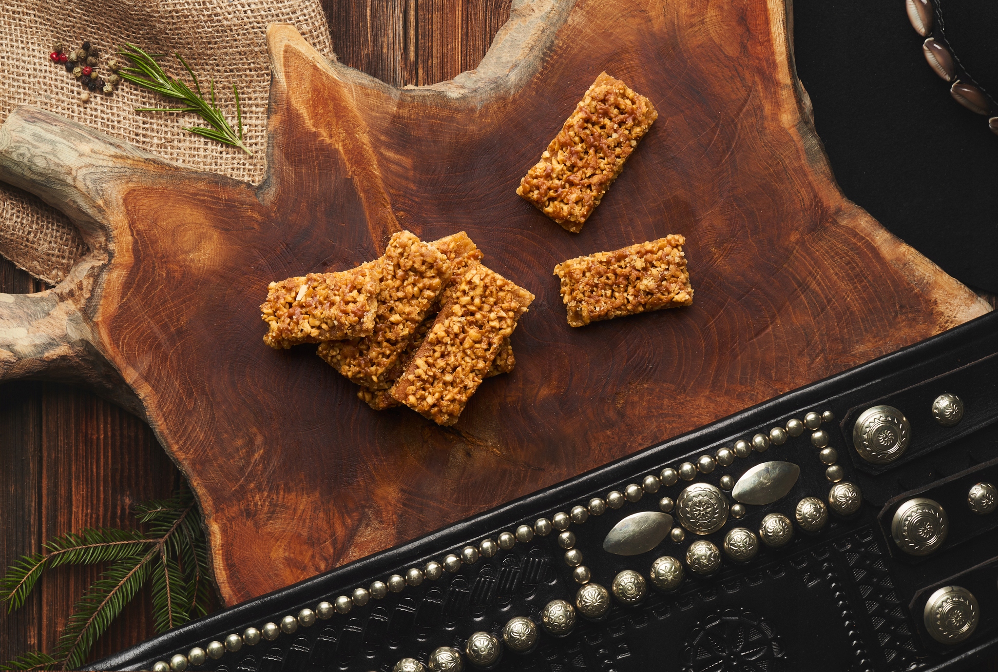 Ингредиенты: мед пчелиный (29,7%), пшеничная мука, маргарин, сливочное масло, сахар, арахис (4,9%), миндальные хлопья (4,9%), семена подсолнечника (4,9%), сливки, сахар, вода. , корица, ванильный сахар, бикарбонат аммония.
