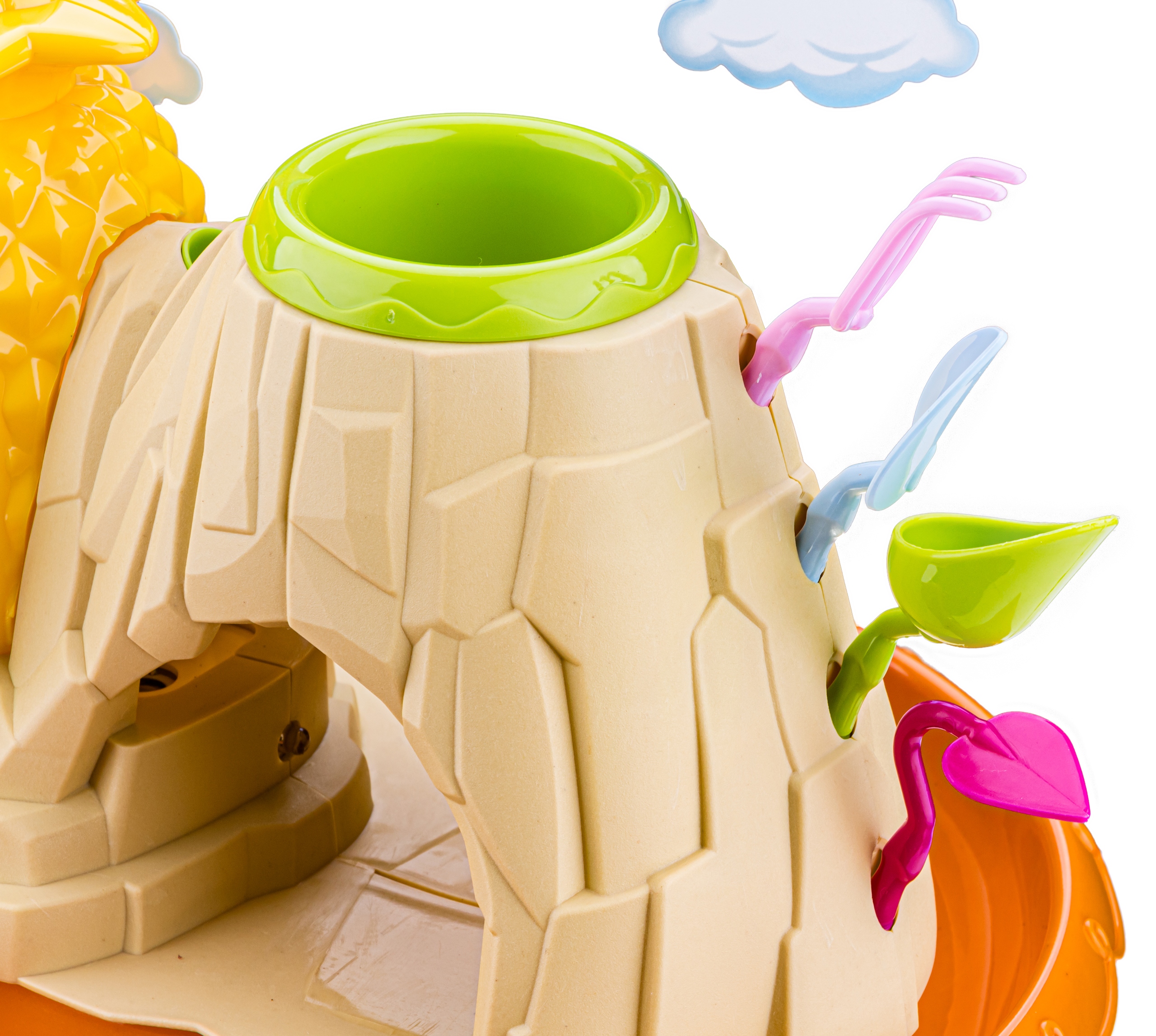 Pot также может служить в качестве сказочного кукольного домика. В доме в форме ананаса есть большая дверь, поэтому у нас есть удобный доступ во внутреннюю. Набор также включает в себя собаку и стол с зонтиком и двумя стульями.
