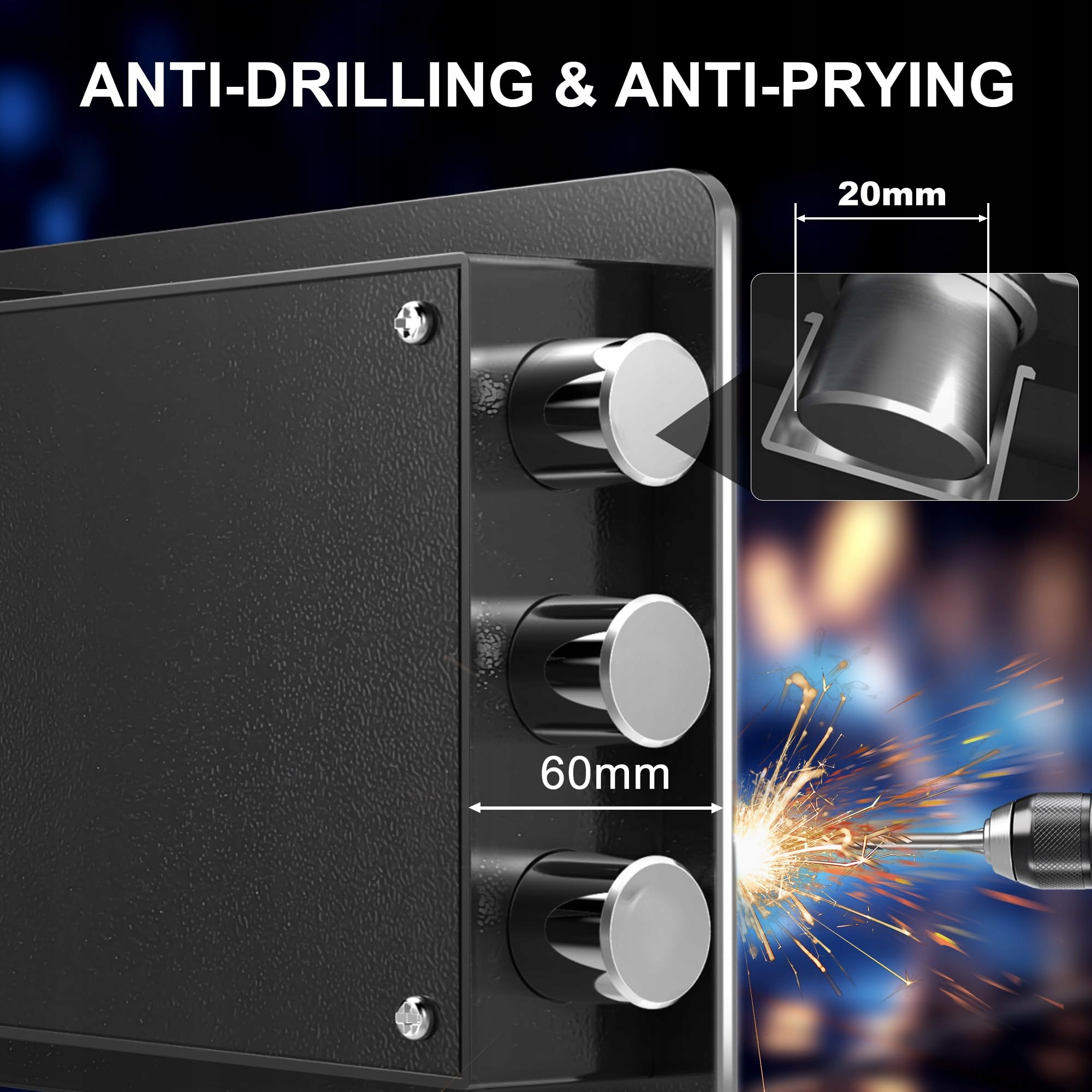 Этот сейф изготовлен из высококачественной холодной углеродной стали, что является прочным и надежным. Он имеет три блокирующие винты с диаметром 20 мм, которые обеспечивают максимальную ценную безопасность по сравнению только с двумя защелками, доступными на рынке. Между тем, сейф для денег строго протестирован, чтобы обеспечить отличный продукт. Размер: 36 * 27 * 26,5 см