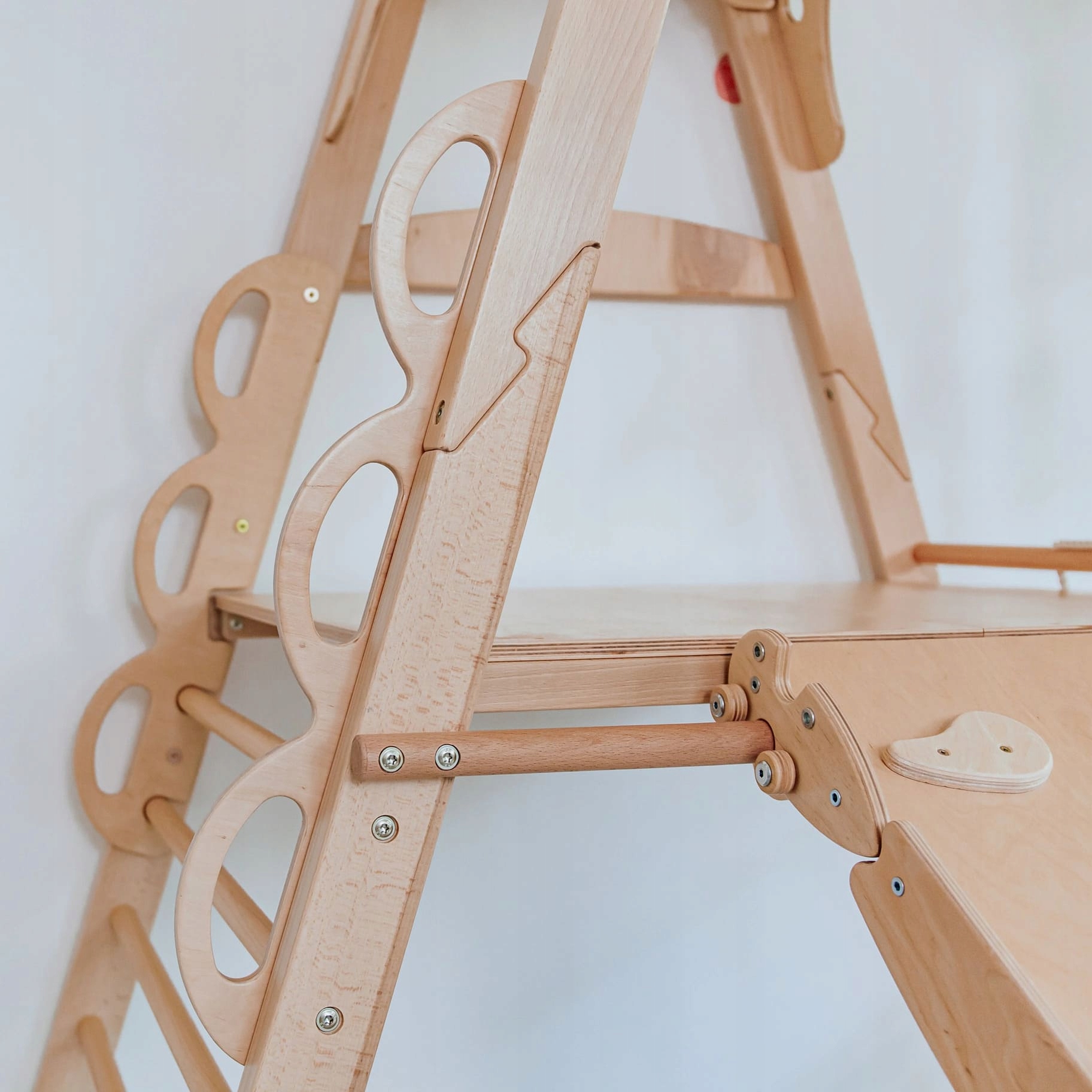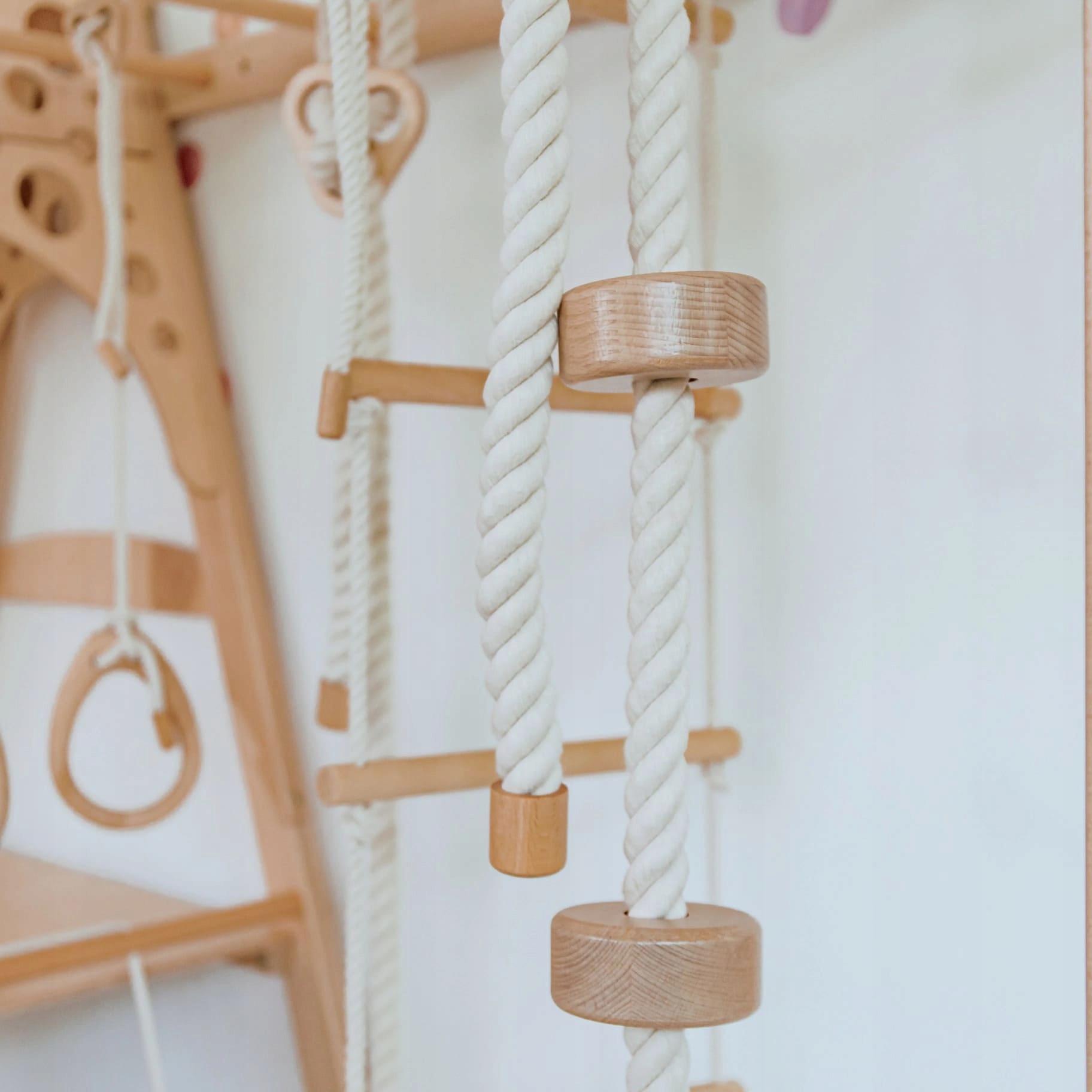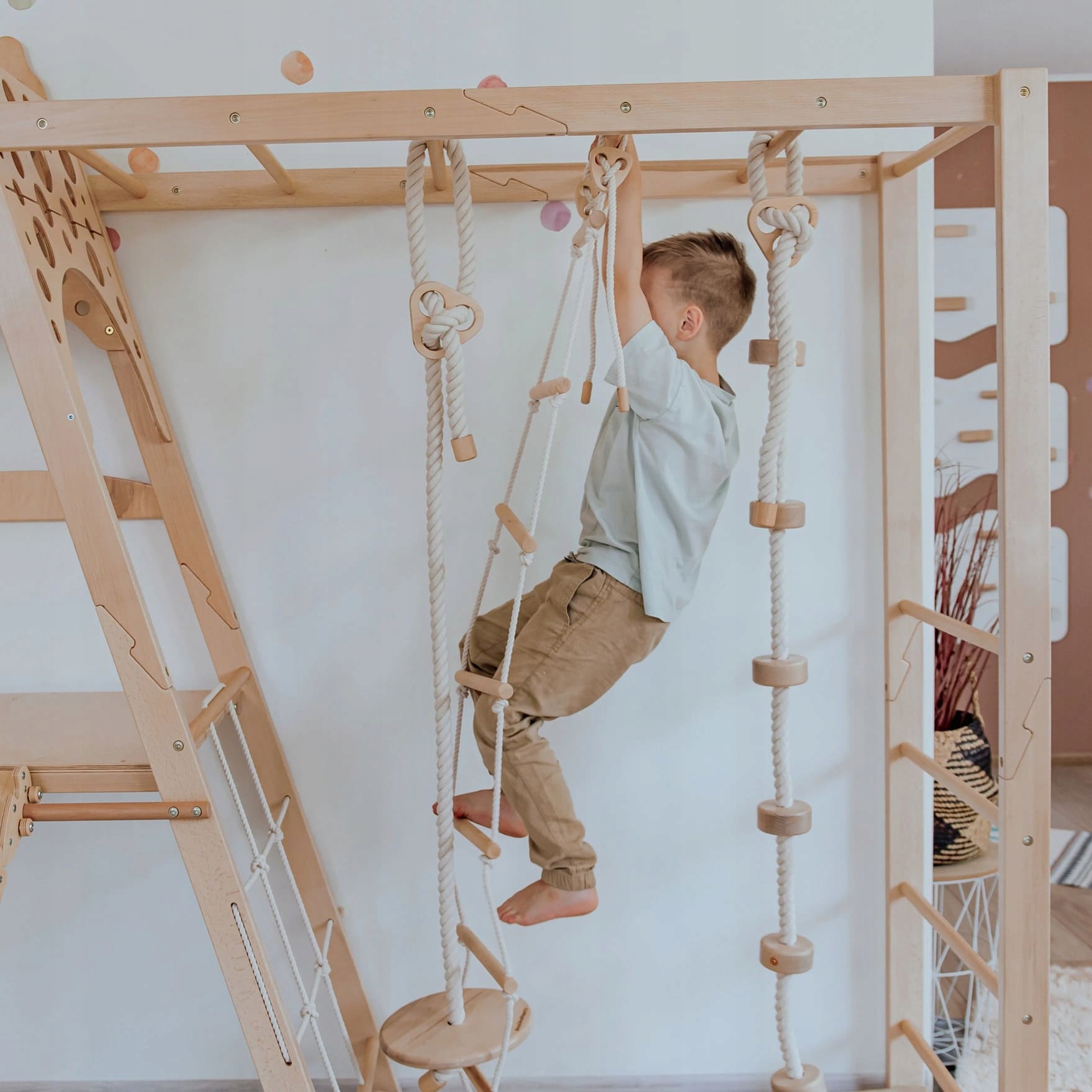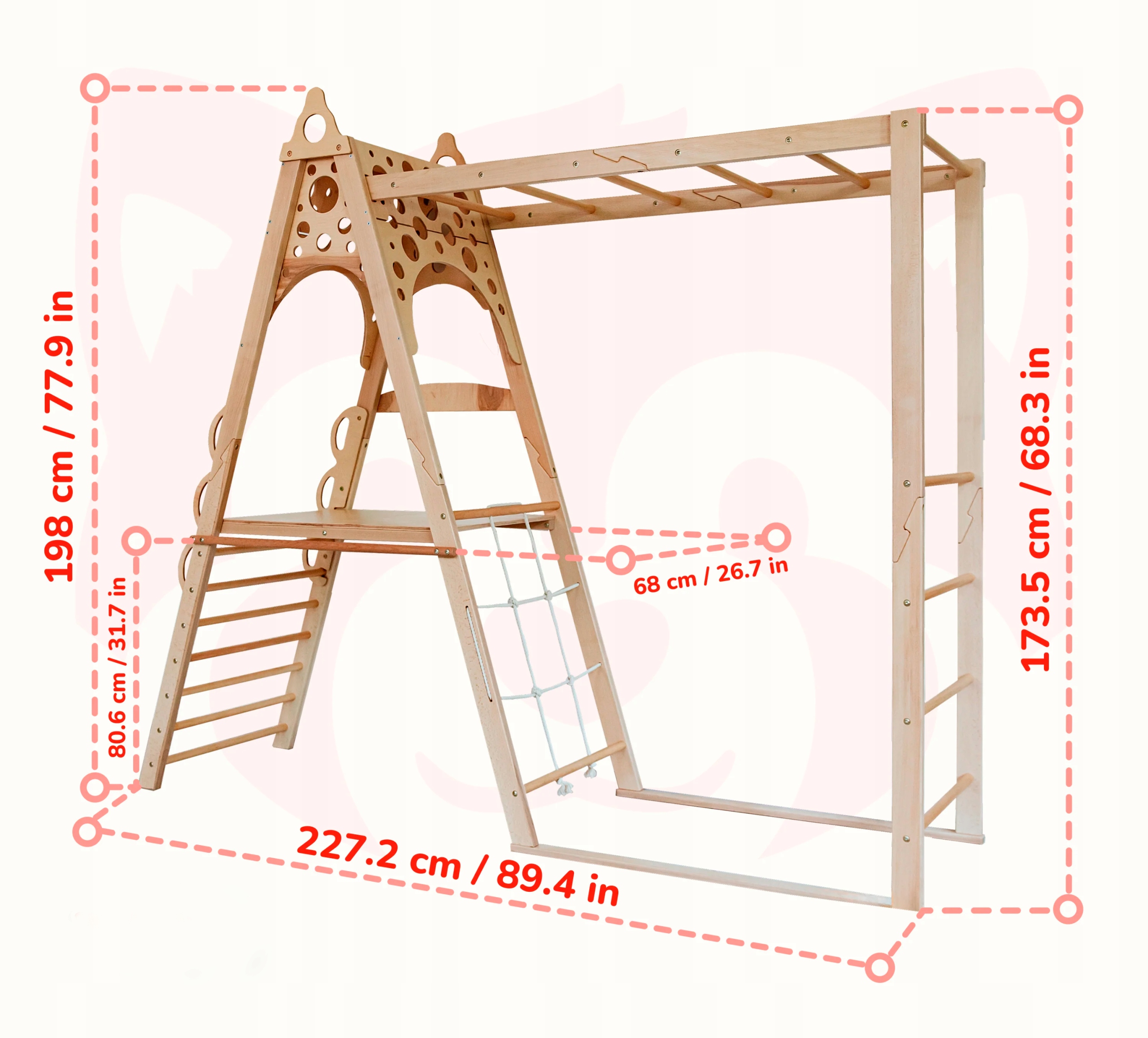 В наборе вы найдете до 2 мягких матрасов, благодаря тому, что каждый прыжок и скалолазание еще безопаснее. Сплошная конструкция из буковой фанеры и фанеры и пасеты, натуральные цвета делают игровую площадку красиво вписаться в любой интерьер.