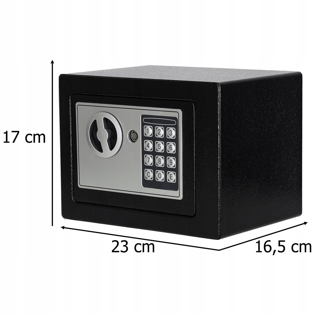 <ул> <ли> Ширина сейф: 23 см. <ли> Высота сейф: 17 см. <ли> Глубина сейф: 16,5 см. <ли> Размеры внутренняя часть сейфа: 16,5 x 16 см. <ли> Размеры дверь: 17 см х 12 см. <ли> Вес безопасно: ок. 1,8 кг <ли> Вес продукт с упаковкой: ок. 2 кг <ли> Размеры упаковка: 24 см х 20 см х 20 смПродукт упакован в коричневую картонную упаковку