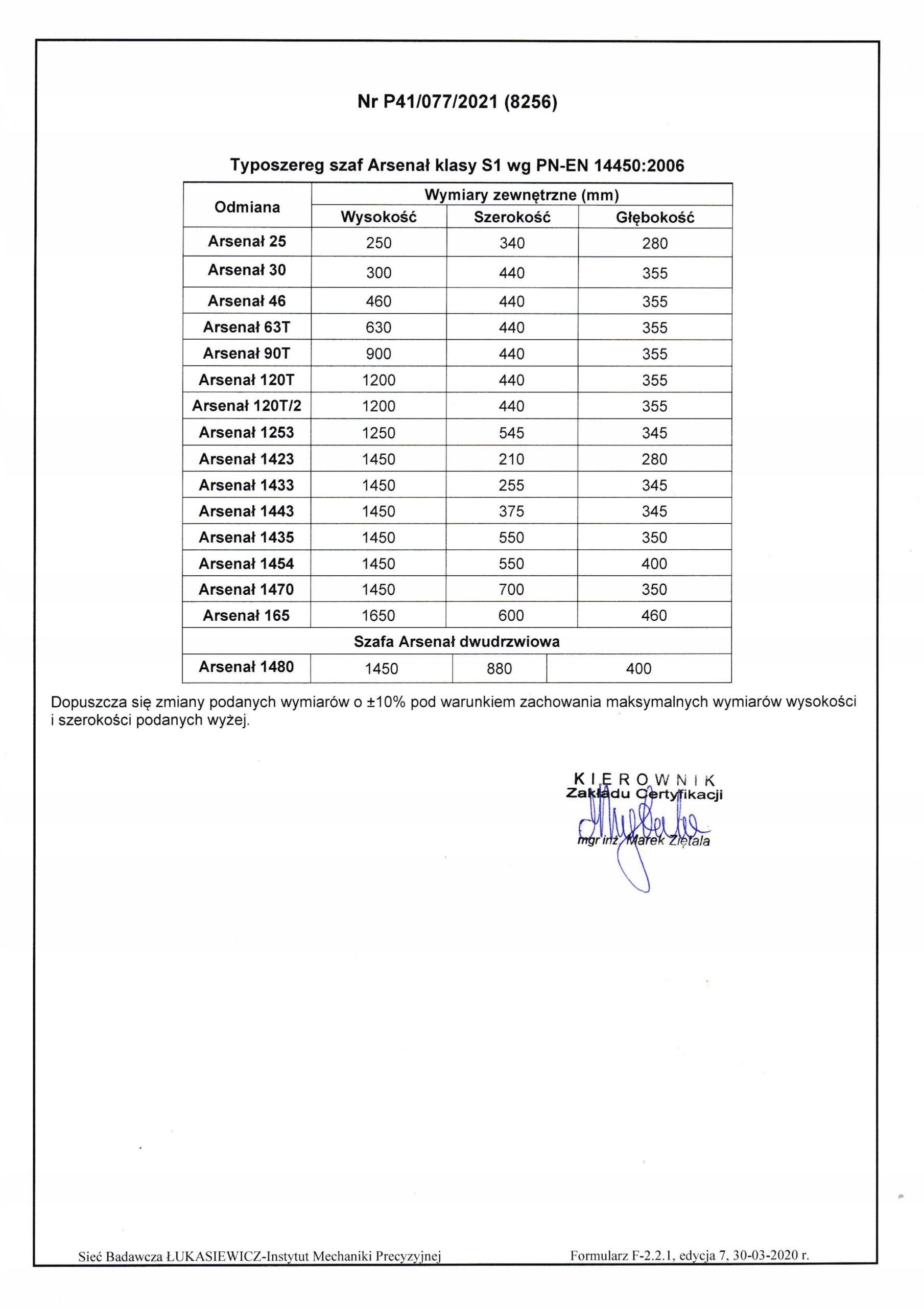 Класс С1, аттестован Институтом точной механики. На каждом сейфе имеется паспортная табличка, подтверждающая соответствие сейфа стандарту PN-EN14450 и классу S1.