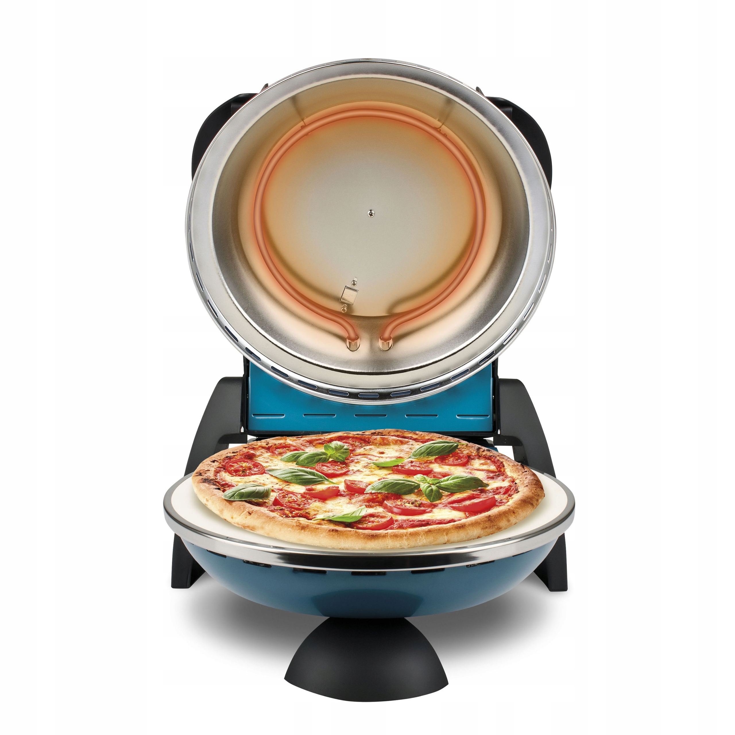 Два нагревателя, верхний и нижний, гарантируют равномерное пропекание вашей пиццы, нижний нагреватель, покрытый огнеупорным камнем, отвечает за идеальное пропекание теста и удаление лишней влаги из камня. тесто! .
