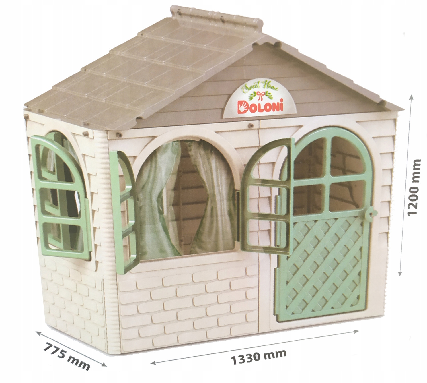 Просторный садовый домик станет любимым местом для игр вашего ребенка. В доме есть открывающиеся ставни и двери, а также карниз со шторами. Несомненным преимуществом дома является простота сборки и его устойчивость. Домик пригоден для использования как в помещении, так и на улице.