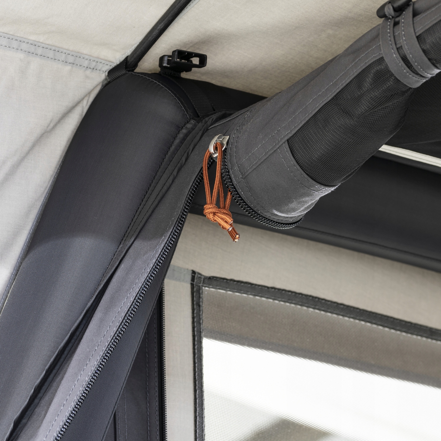 В отличие от палаток, оснащенных традиционным металлическим каркасом, Dometic TRT использует инновационную надувную раму, которая не только очень мощная и долговечная, но и дает значительные преимущества, особенно в контексте воздействия внешних погодных условий. Следует отметить один ключевой аспект: надувной каркас делает палатку TRT гораздо более устойчивой к сильному ветру по сравнению с моделями с металлическим каркасом. Отсутствие жестких элементов исключает риск разрушения конструкции под воздействием сильных порывов ветра, что является распространенной проблемой в конкурентных палатках.