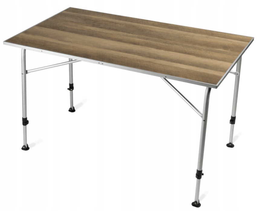 Сверхлегкий большой походный стол с регулируемыми ножками. Оснащен легкой алюминиевой рамой и столешницей с эффектом дубовой поверхности.