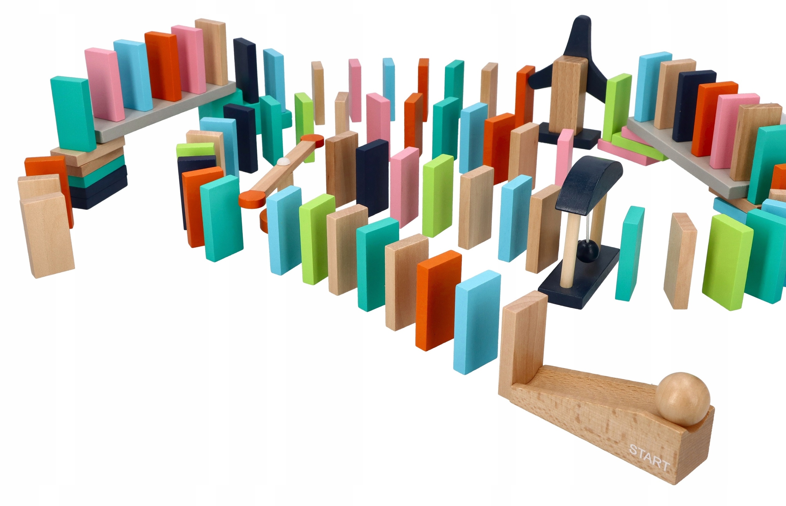 Классическое домино от Adam Toys состоит из разноцветных кубиков, из которых можно создавать различные извилистые дорожки. В набор входят деревянные кубики, которые позволяют создавать различные комбинации, а значит игрушка не надоест вам слишком быстро. Ваша акробатическая дорожка может каждый раз выглядеть по-разному. Дополнительная диверсификация включает в себя такие элементы, как вращающаяся карусель, ветряная мельница, лестница и ворота с мячом. Теперь все, что вам нужно сделать, это установить стартовую горку, толкнуть мяч, и веселье начнется. Благодаря этому ваш трек, помимо оригинальной формы, будет иметь еще и уникальные элементы, которых нет в других наборах:)