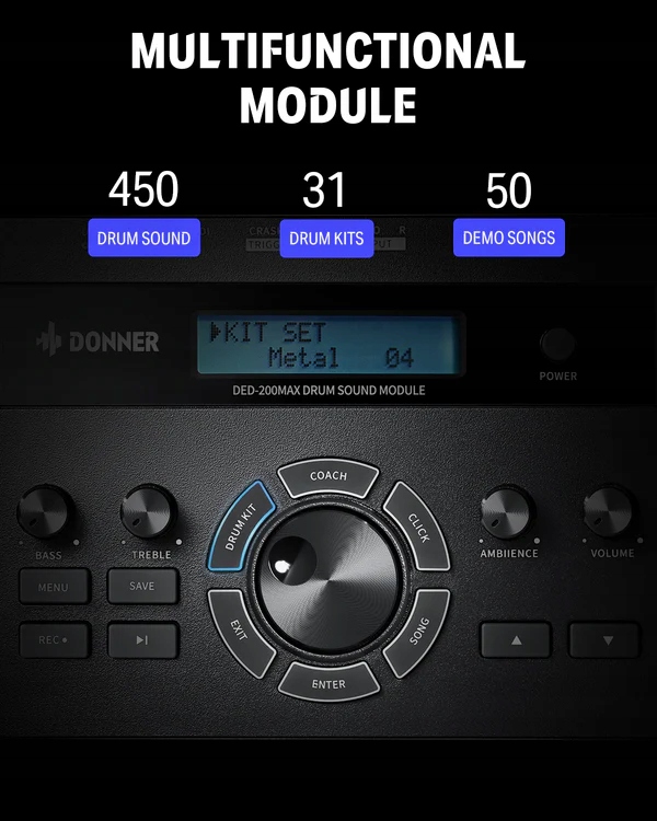 Donner DED-200 MAX благодаря точному семплированию реальных барабанов он предлагает 450 звуков и 31 классический и современный набор перкуссии, чего вполне достаточно. Встроенные 50 песен, секвенсор, метроном и функция записи полезны. инструменты, позволяющие барабанщикам практиковаться и развивать свои навыки, а совместимость со смартфоном и MP3-плеером делают этот набор идеальным для домашних занятий или сольных выступлений!
