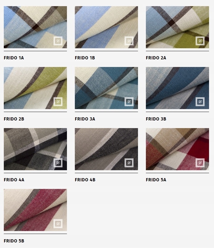 Ткань FRIDO (Лех) - — приятная на ощупь и светостойкая ткань нежного переплетения. FRIDO — это чрезвычайно классический, элегантный и вневременной узор в клетку или полоску. Ткань доступна в четырех цветовых вариантах, которые идеально сочетаются со стильной клеткой и полосками. Все эти особенности делают ткань FRIDO идеальной не только для обивки всего предмета мебели или отдельного ее элемента, но и как материал для создания стильных, шикарных и интересных аксессуаров.
