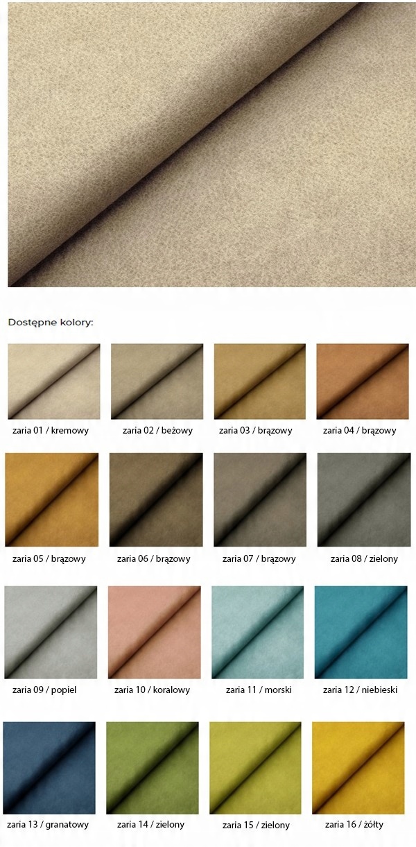 Ткань ZARIA – уникальная коллекция тканей из нубука. Их приятная и приятная на ощупь структура хорошо ложится на мебель, а насыщенные цвета подчеркнут преимущества дивана, углового дивана или кресла, обитого текстилем. Материал ограниченно впитывает жидкость, а это значит, что пролитый на ткань кофе или сок можно легко удалить сухим полотенцем. Кроме того, ткань обладает хорошей устойчивостью к солнечному свету, поэтому цвета долго сохраняют свою интенсивность.