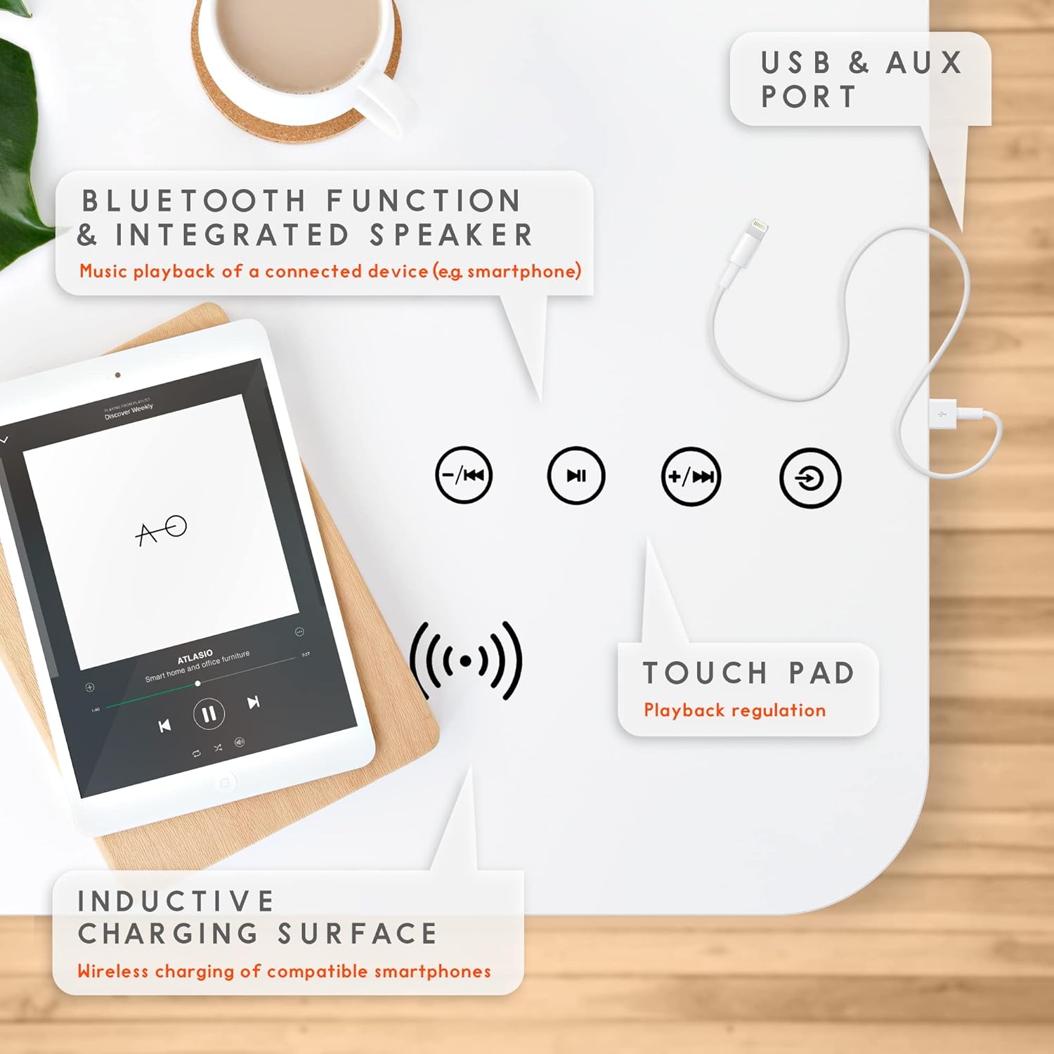 Вспомогательный таблица White Designer с динамиком Bluetooth объединяет несколько интеллектуальных функций в одной таблице: индуктивная зарядная поверхность для беспроводной зарядки (10 Вт); Bluetooth и встроенный динамик для воспроизведения музыки и аудио -подключенного конечного устройства; Осторожный USB и Aux Port для зарядки конечных устройств (5 В) и воспроизведения музыки; Сенсорная панель для замены воспроизведения.