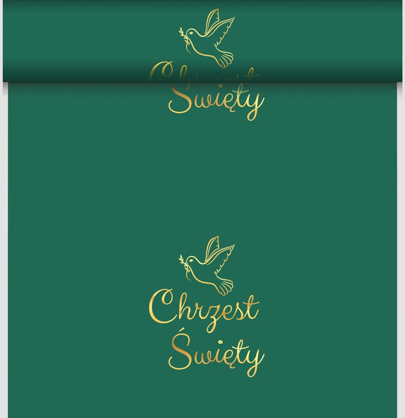 Очень элегантная зеленая скатерть, с помощью которой вы создадите неповторимое украшение торжественного стола. На нем модная золотая надпись: Святое Крещение с голубем. Это станет прекрасной основой для подготовки к крещению вашего ребенка. Элегантные цвета смотрятся эффектно и подойдут как для крещения мальчика, так и для девочки. Все это выглядит эксклюзивно и обязательно очарует ваших гостей. Дорожка отлично смотрится на столе с салфетками из той же серии