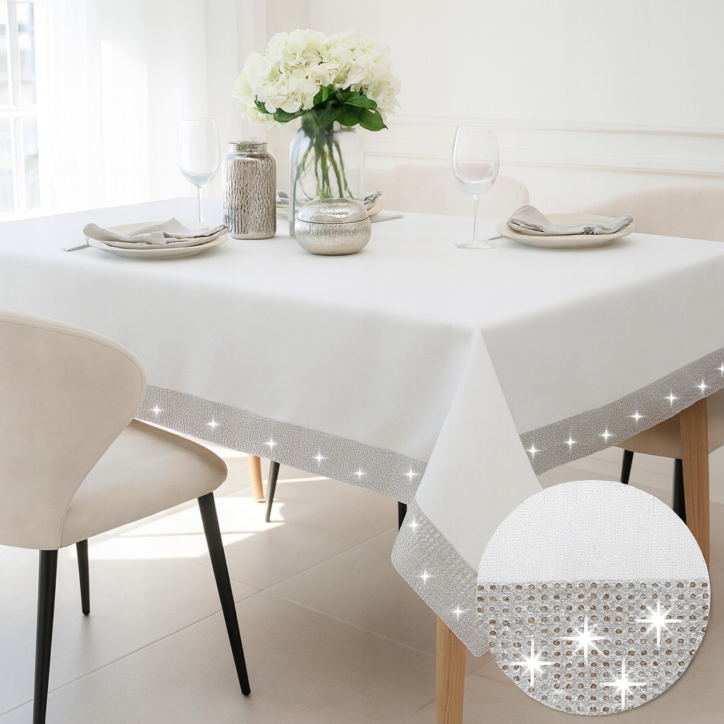 Скатерть с тонкими стразами — идеальное сочетание класса и современности. Ее нежный блеск прекрасно подчеркивает рождественскую атмосферу, придавая интерьеру неповторимый шарм.
