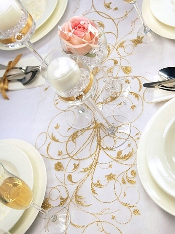 Органза кремового цвета с золотистым односторонним принтом с блестками. Длина 9 метров, ширина 36 см. Органза подходит в качестве дорожки для стола, украшения на Рождество, сочельник, свадьбу или вечеринку по случаю Первого причастия. Ниже приведены некоторые примеры договоренностей: