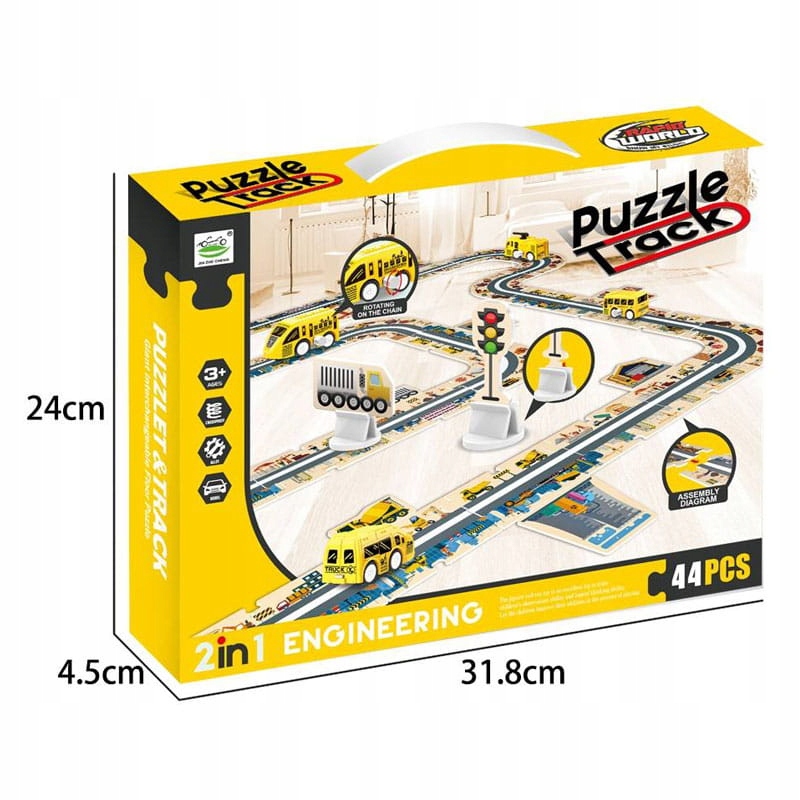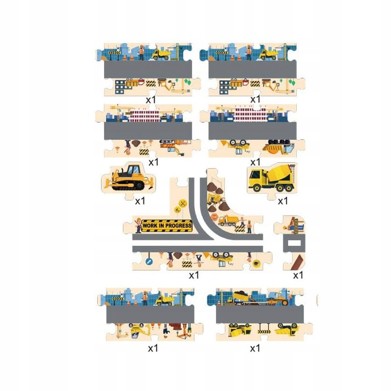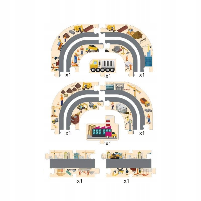- дорога - трасса для маленьких машинок в виде пазла - вырезанная небольшая канавка позволяет машине свободно передвигаться. Пазлы можно собирать любым способом, выстраивая таким образом различные маршруты. В нашем предложении 5 моделей дорожных пазлов (Динозавры, Полиция, Пожар, Город, Строительство), благодаря которым вы сможете построить трассу длиной более 5 метров.