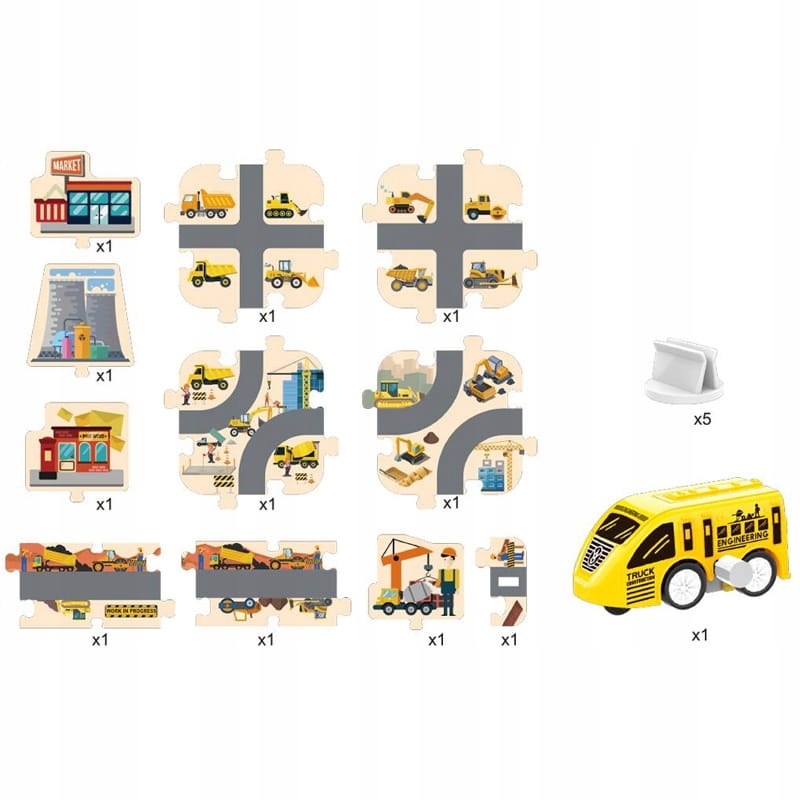 - количество элементов: 44 штуки (в том числе 5 зданий/3 строительных машины, 2 стоячих дорожных знака) + игрушечная машинка, бегущая по рельсам (пластик) - с ручным заводом