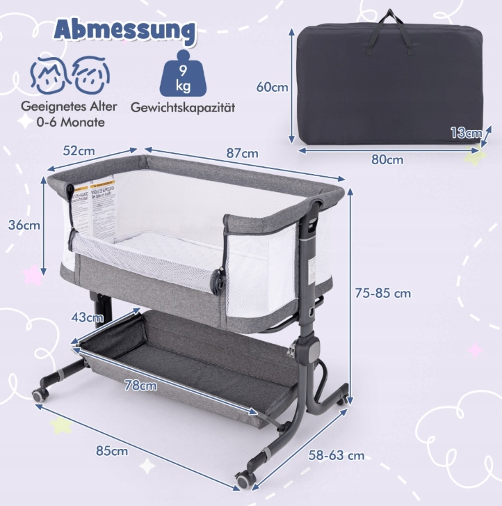 Благодаря 6 настройкам высоты (от 75 до 85 см) эта боковая кровать подходит для кроватей разной высоты, обеспечивая легкий доступ к ребенку для кормления. Ремни безопасности обеспечат безопасность вашего ребенка прямо рядом с кроватью. Уютный матрас изготовлен из высококачественных материалов, обеспечивающих комфортный сон. Складная и портативная конструкция идеально подходит для путешествий, а универсальные колеса с возможностью блокировки позволяют легко передвигаться.