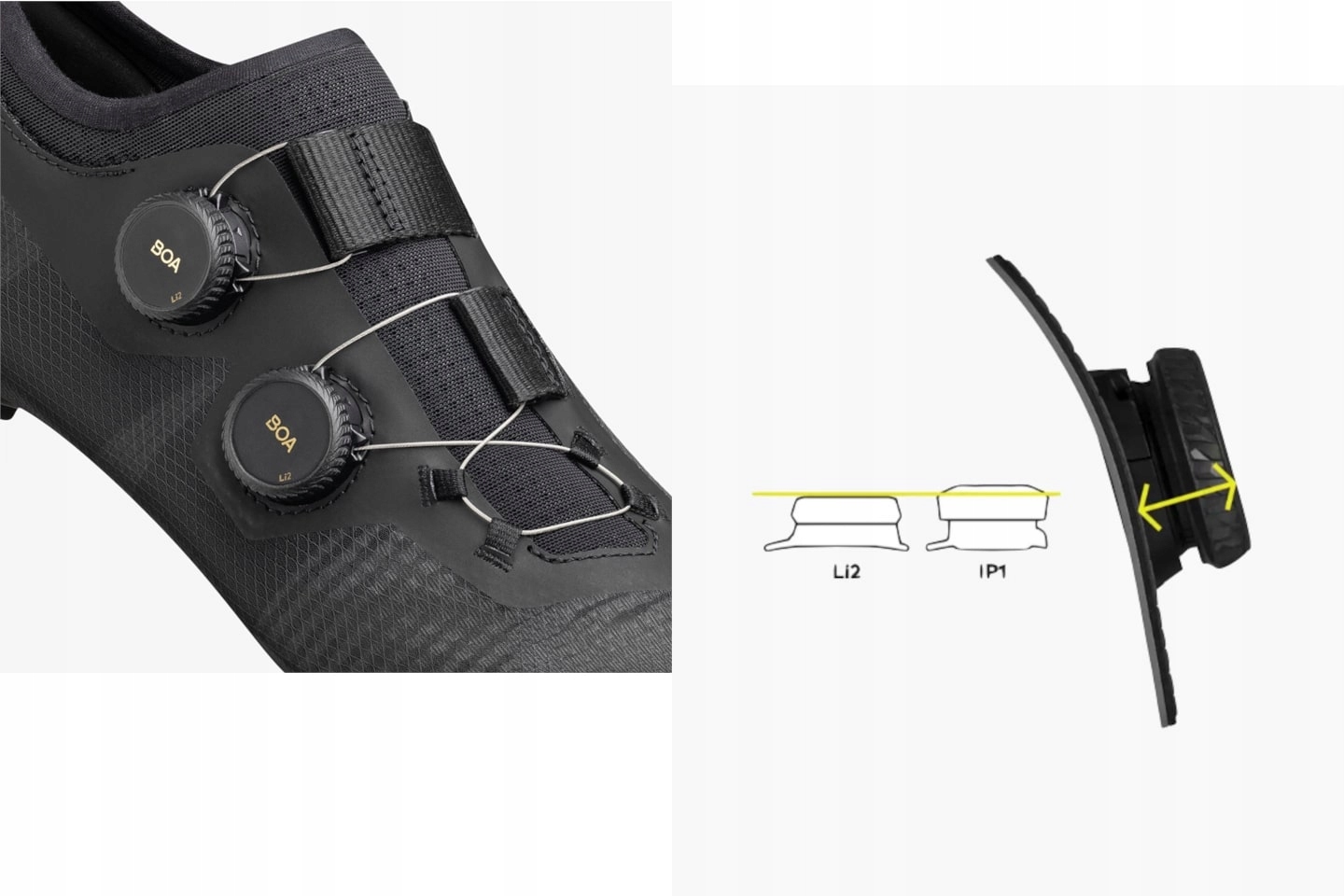 Подъемник и средняя часть стопы регулируются независимо, что обеспечивает индивидуальную посадку благодаря системе Dual-Dial Li2 BOA® Fit. Два отдельных диска BOA®, соединенные с панелями, охватывают внутреннюю часть стопы, позволяя обуви точно адаптироваться к уникальной форме стопы велосипедиста, обеспечивая длительную поддержку.