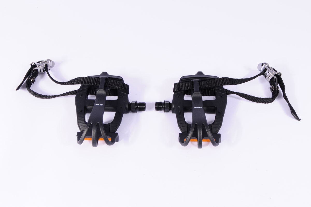 Дорожно-городские педали XLC PD-R01 в комплекте с туклипсами и ремнями крепления. Идеальное решение для быстрых городских велосипедов, таких как фиксированная передача, уличные велосипеды и прогулочные шоссейные велосипеды.