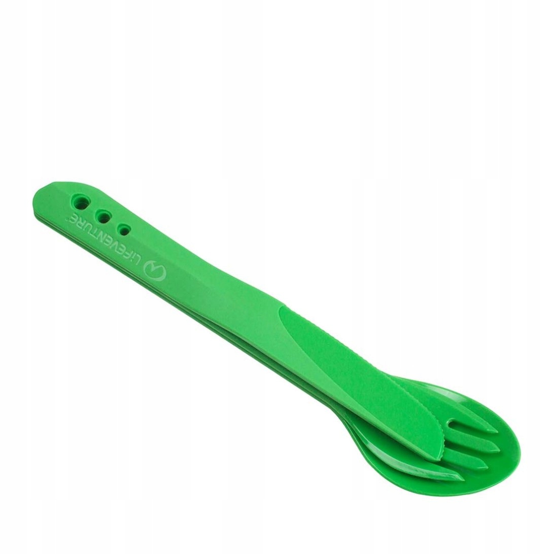 Набор столовых приборов Lifeventure, состоящий из ложки, ножа и вилки. Столовые приборы изготовлены из легкого и очень прочного пластика, не содержащего BPA. Они занимают очень мало места, поскольку их можно соединить вместе. Чрезвычайно компактный – идеально подходит для путешествий и школы