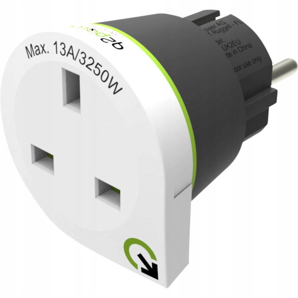 Дорожный адаптер, вилка: GROSSBRITANNIEN, разъем: Защитный контакт (Европа), напряжение: 100 - 250 В, ток: 10 А, цвет: Белый, зеленый, серый Внимание! Описание этого продукта было переведено автоматически.