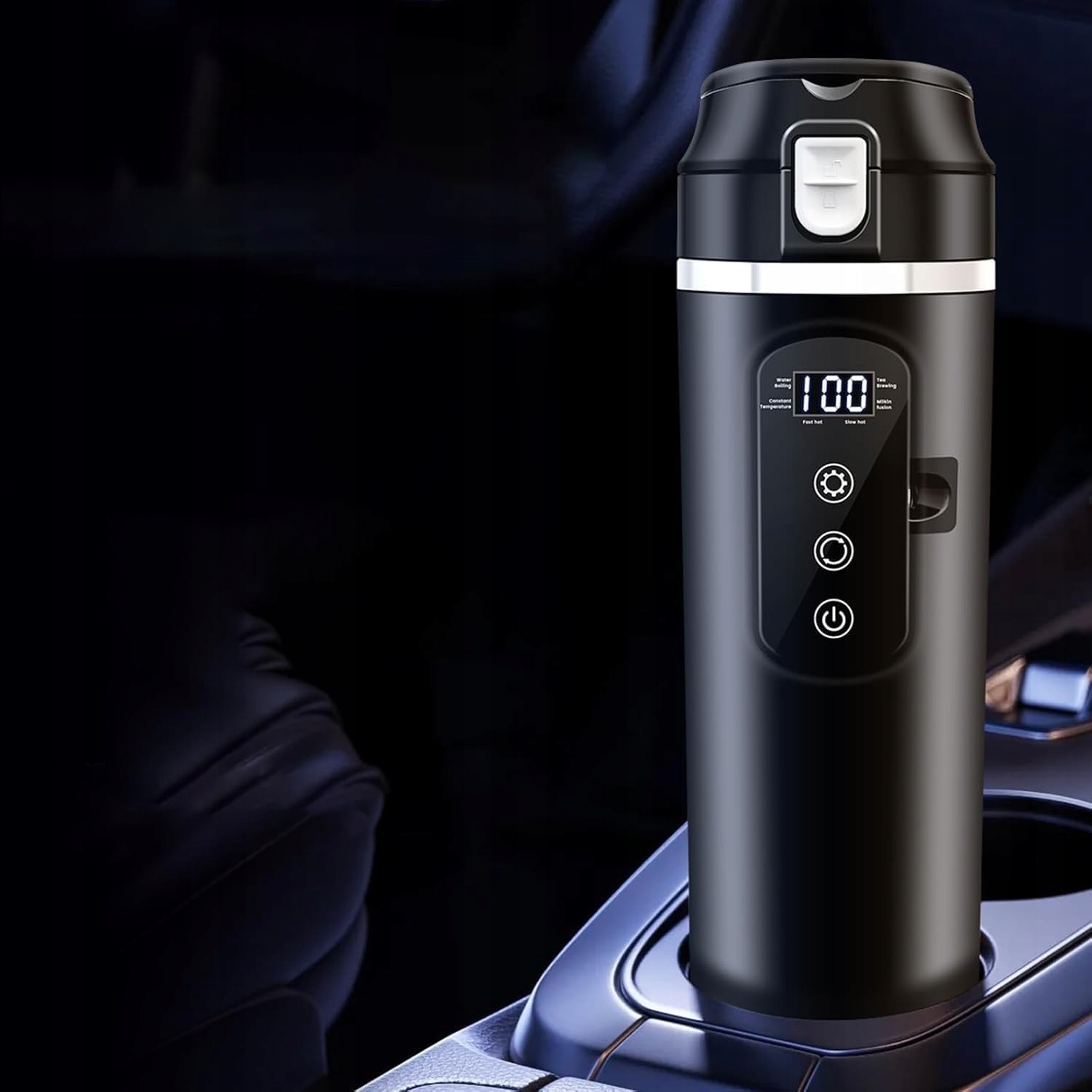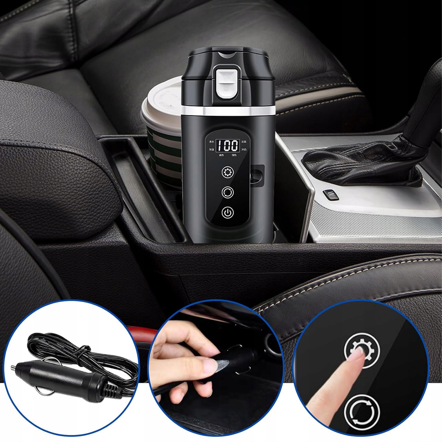 ✅☕【Портативная электрическая дорожная кружка для автомобиля】Умный автомобильный чайник с умной сенсорной панелью. Вы можете быстро выбирать различные диапазоны температур, нажимая «☼», «Приготовление ≈ 100°C», «Чай ≈ 90°C», «Молоко = 45°C», «Нагревание». Вы можете регулировать температуру, нажав «O». Быстрое управление с помощью сенсорного экрана