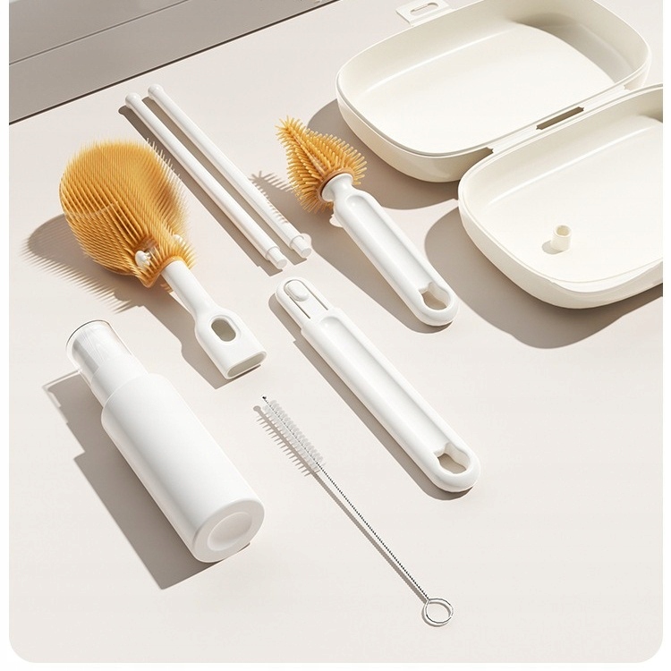 Комплексное решение 6 в 1. В комплект для чистки бутылочек входят щетка для бутылочек, щетка для соски, щетка для соломинок, сушилка и дозатор мыла — все в одном органайзере, что обеспечивает универсальное решение для разнообразной уборки. требует очистки.