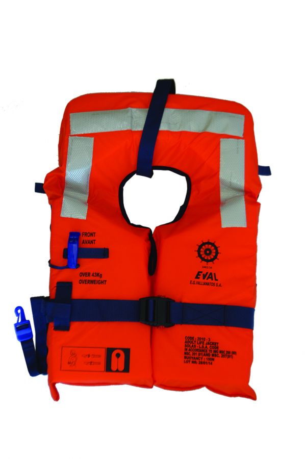 Спасательный пояс 150Н от Eval предназначен для взрослых и негабаритных людей весом от 43 до 140 кг.