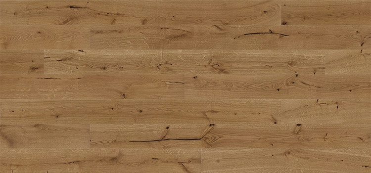 Изделие с ярко выраженными чертами дубовой древесины. Однополосная поверхность пола, подчеркнутая фаской. Рисунок текстуры и глубина цвета древесины усиливаются за счет браширования и покрытия натуральным маслом теплого коричневого цвета.