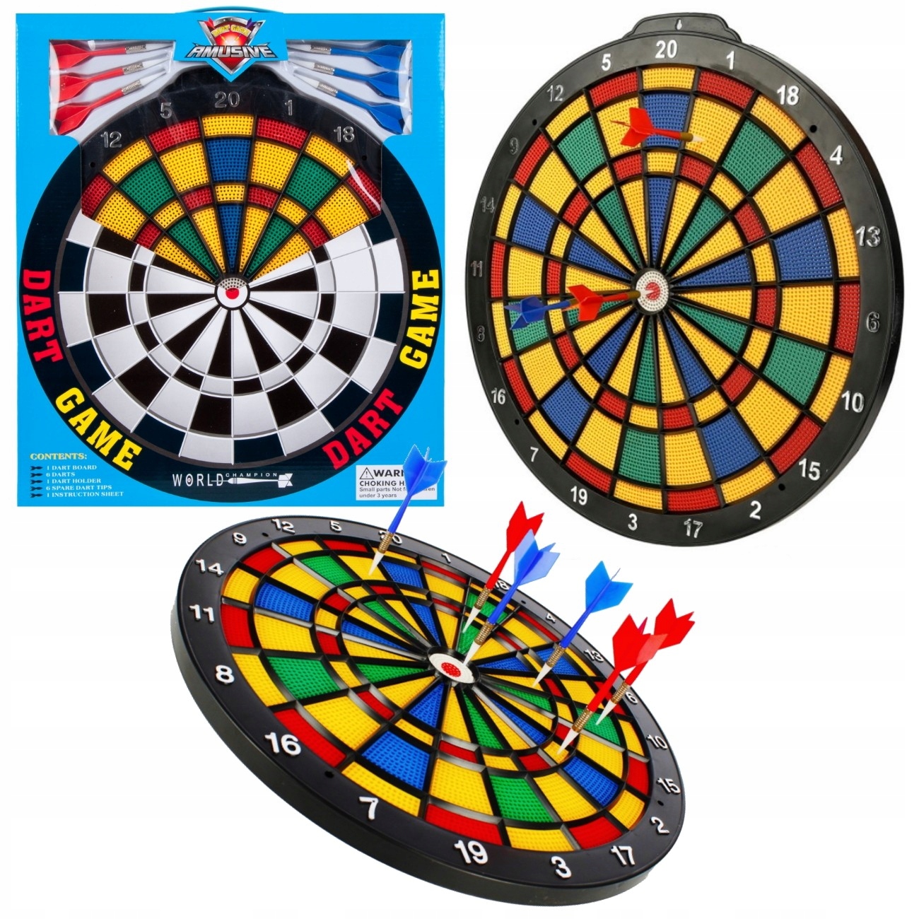 В комплект входят 6 пластиковых дротиков - 3 синих и 3 красных, длиной 12 см каждый.