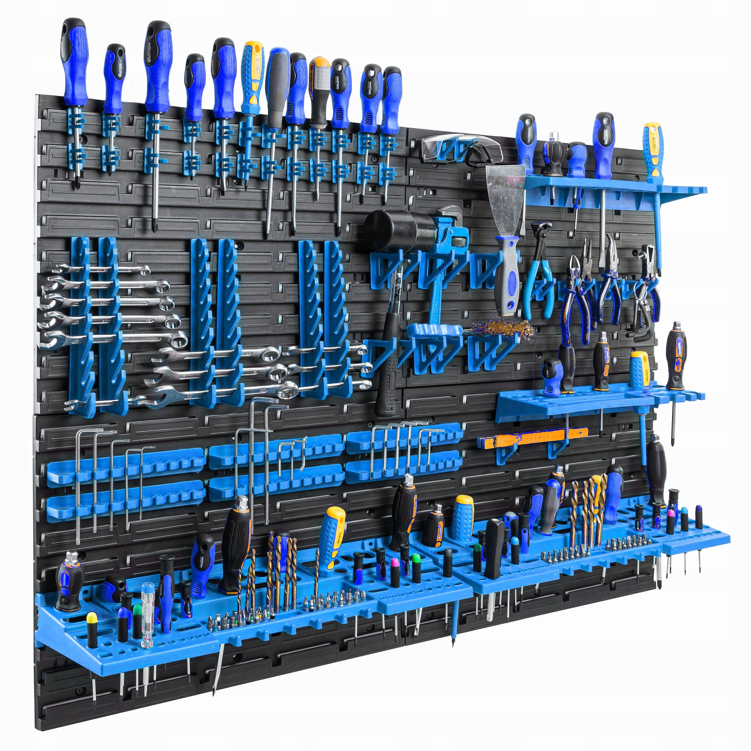 - Комплекты ручек: В комплекте: 2 полки для инструментов 580 х 158 х 67 мм, 2 полки для ящика для инструментов 384 x 111 x 50 мм, 12 держателей для ключей (6 вертикальных, 6 горизонтальных), 24 держателя для отверток, мелкие инструменты, 12 вешалок 5,5 см, 12 вешалок 3,5 см.