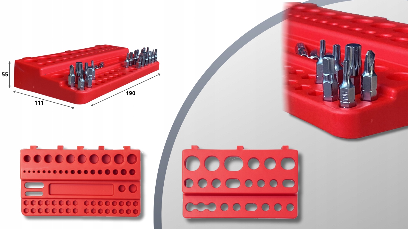На полках есть место для сверл (с описанием диаметра сверла), место для бит, головок, отверток, плоскогубцев, гаечных ключей и различных других ручных инструментов. На полке также предусмотрено ровное место для любых мелочей.