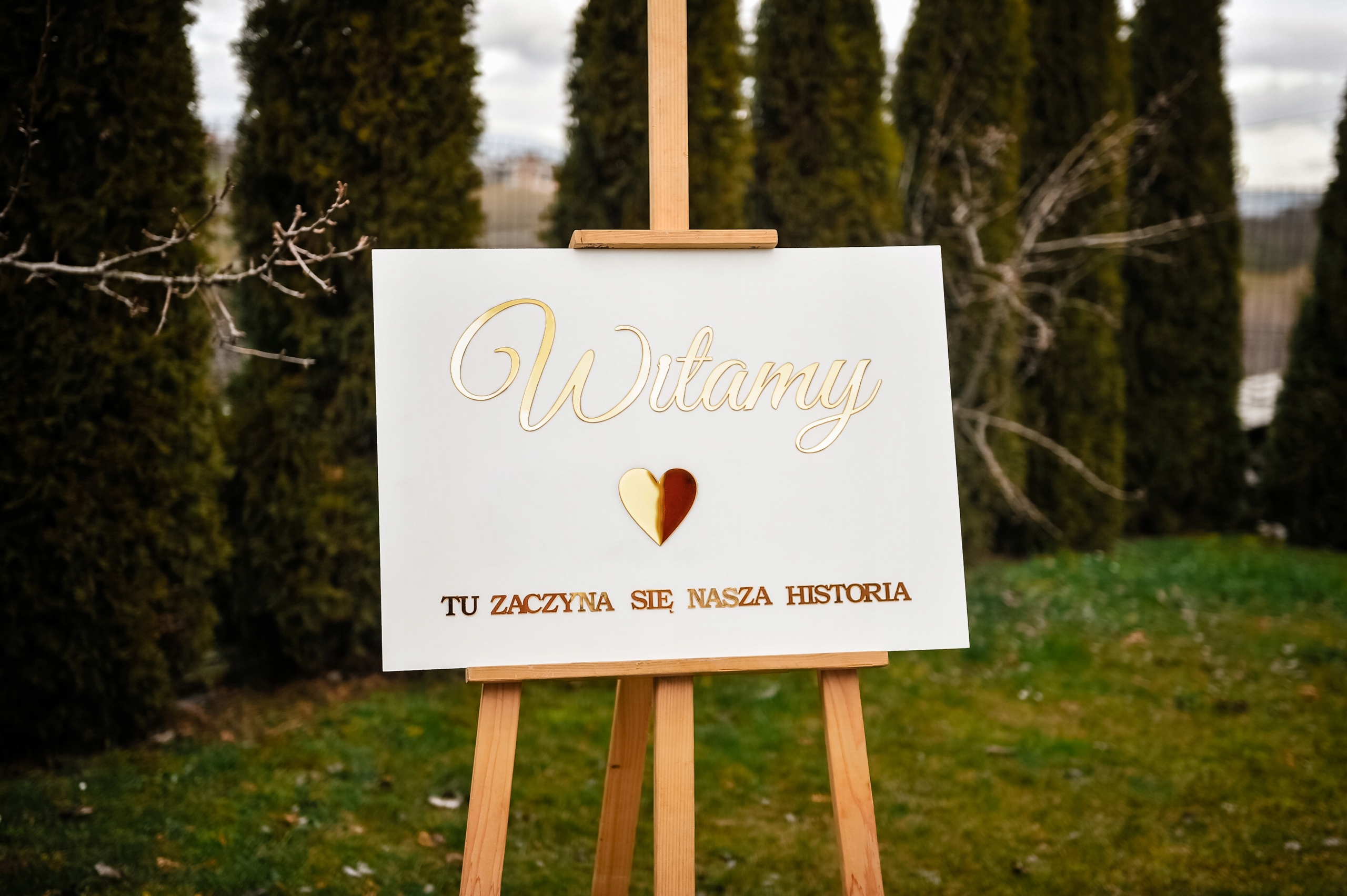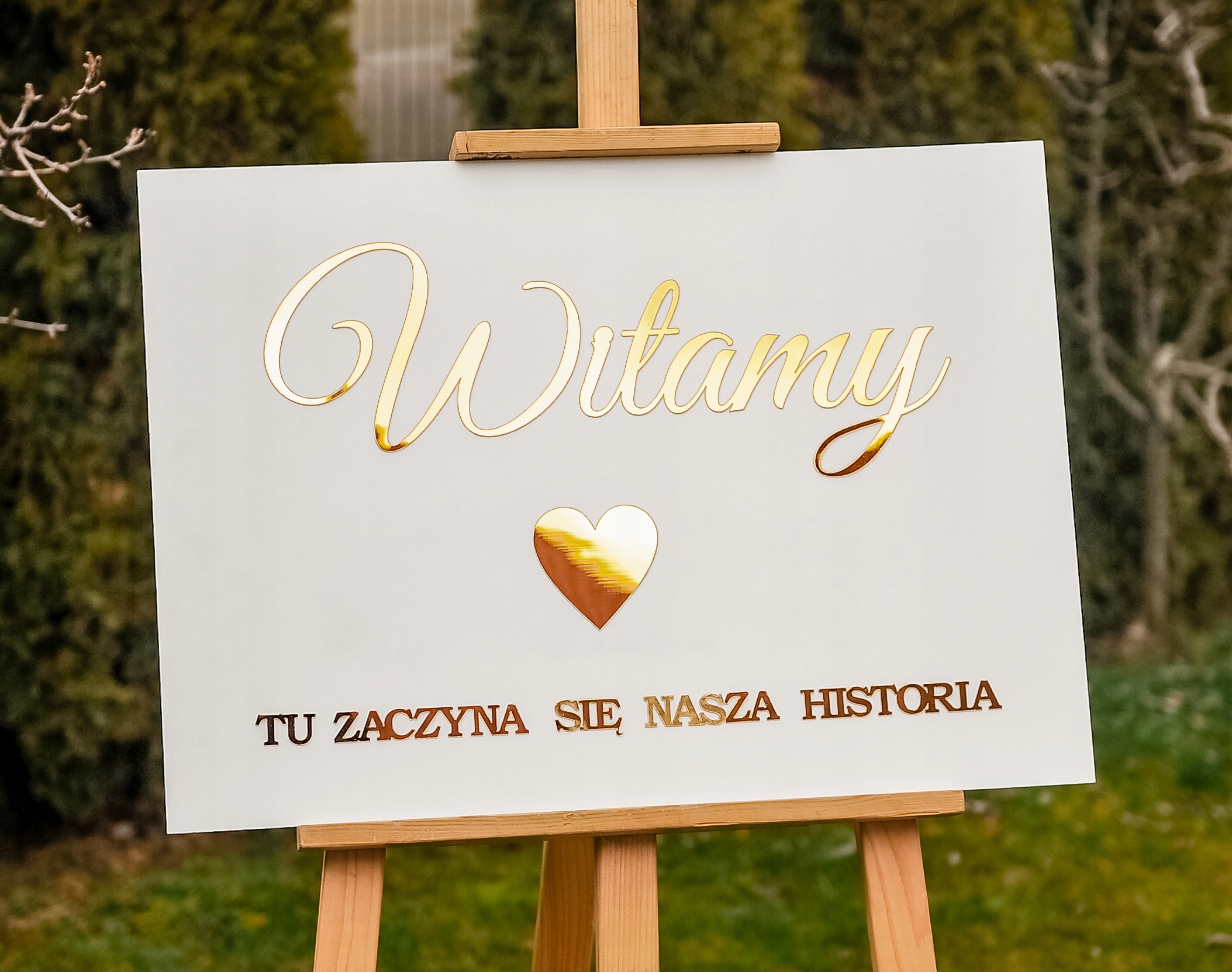 Красивое украшение, встречающее гостей перед домом и перед свадебным залом. Надписи сделаны методом лазерной резки из золотого зеркала и наклеены на белые плиты МДФ.