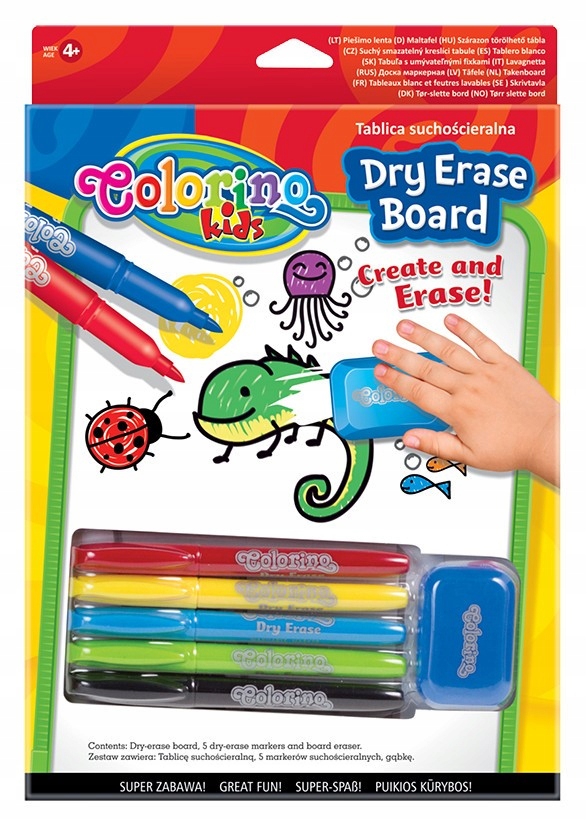 Доска для сухого стирания, предназначенная для обучения письму и рисованию. Идеально подходит дома и во время путешествий. В набор входят 5 маркеров и ластик.