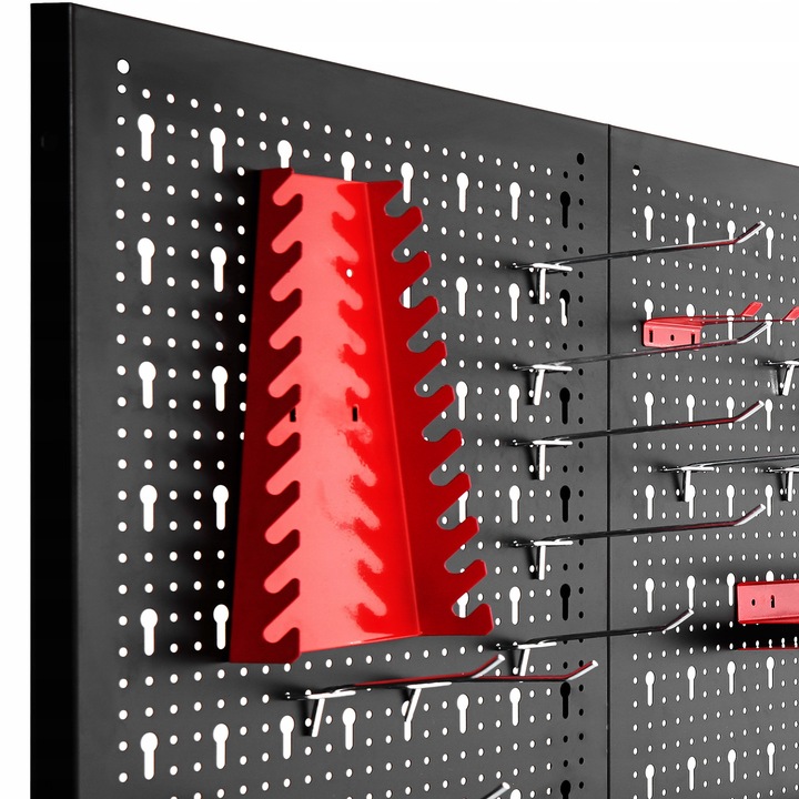 - Перфорированная стенка, состоящая из трех частей, с 25 крючками и кронштейнами.