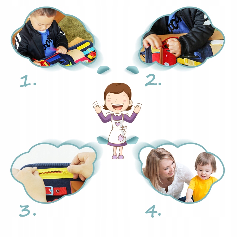 В сумке находятся различные предметы (застежки, пуговицы, молнии и т.п.), которые являются повседневной жизнью взрослых. Однако ребенку необходимо этому научиться.