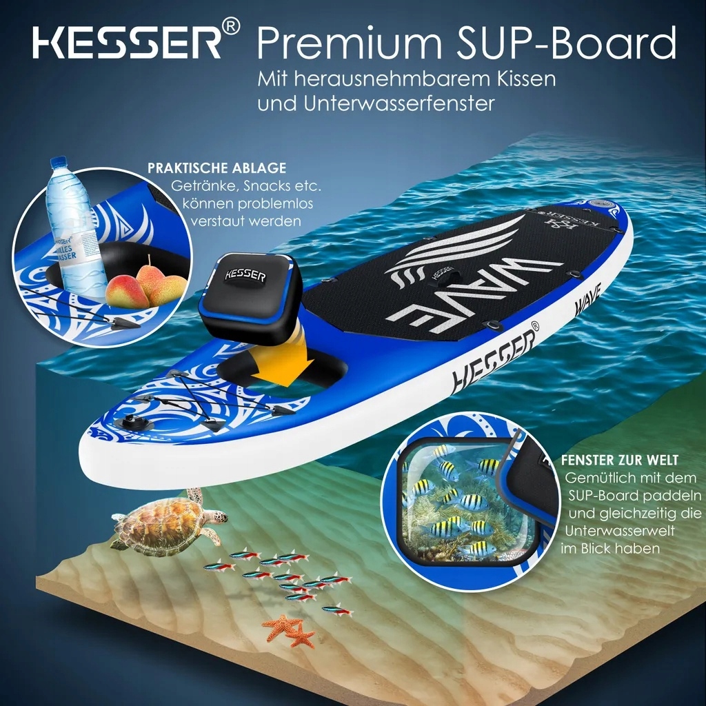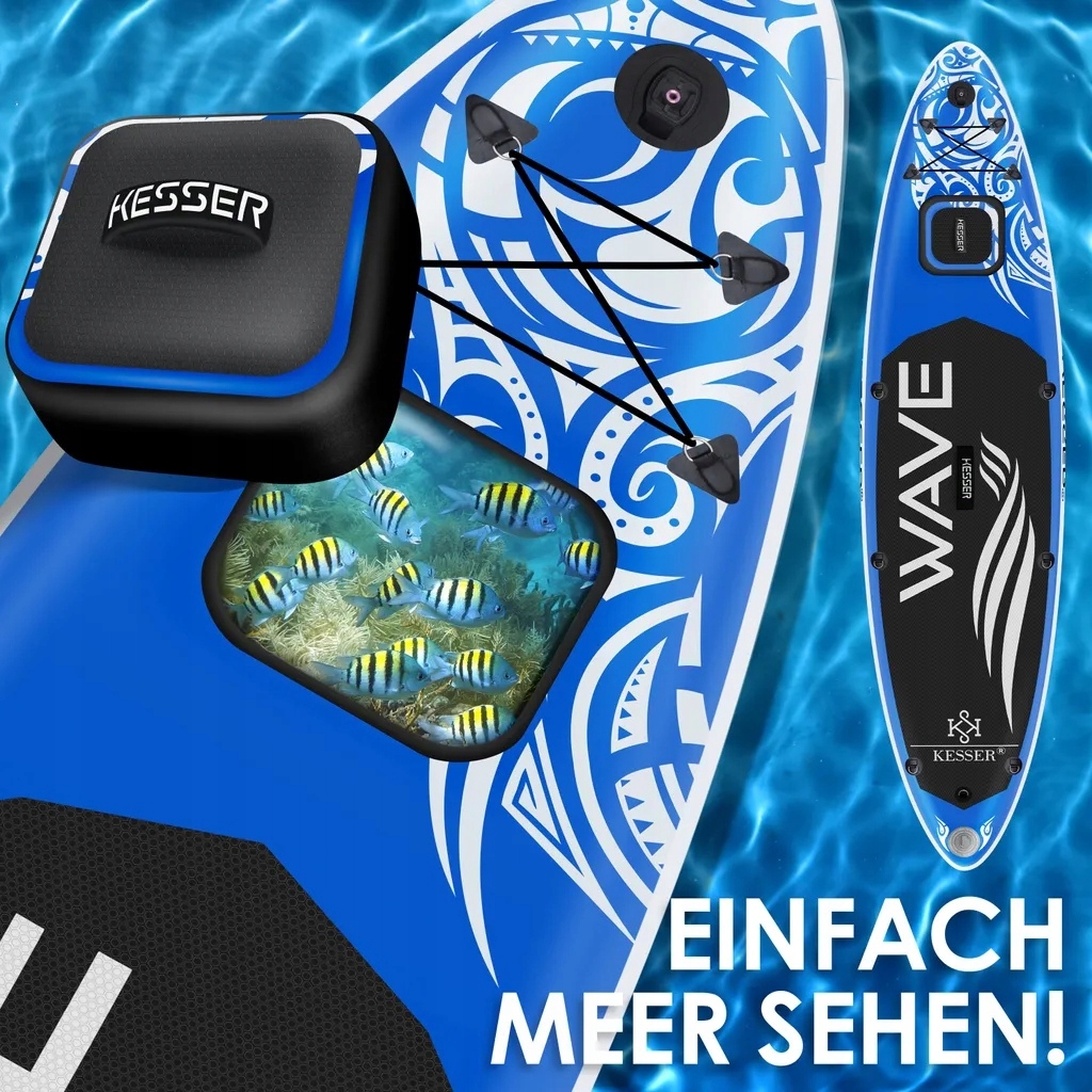 Sup Poard с окном Kesser, практическое хранение и ручки для переноски, ручка для камеры действия, 11x D-колец, воздушный клапан со встроенным контрольным клапаном, высококачественная практическая пена EVA для спортивной камеры во время будущих гребных экспедиций, чтобы захватить отличный материал пленки, используя интегрированную ручку для спортивной камеры, которая совместима со многими камерами. Руководство уже предварительно установлена на пластине и может использоваться немедленно.