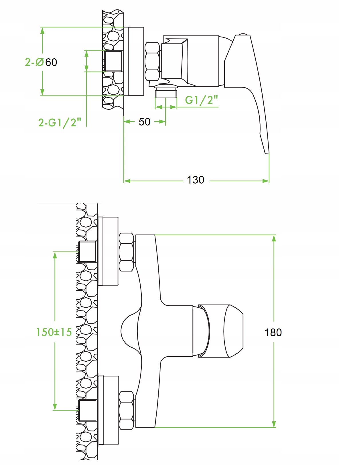- Диапазон от стены: 38 см (до центра насадки душа)